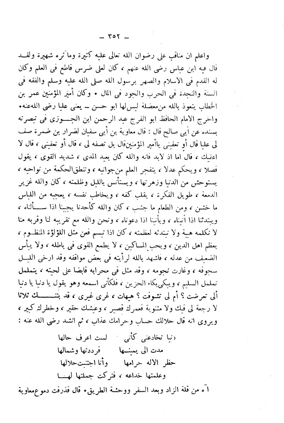 وَاعْلَمْ أَنَّ مَنَاقِبَ عَلِيٍّ - رِضْوَانُ اللَّهِ تَعَالَى عَلَيْهِ - كَثِيرَةٌ وَمَآثِرُهُ شَهِيرَةٌ، وَلَقَدْ قَالَ فِيهِ ابْنُ عَبَّاسٍ - رَضِيَ اللَّهُ عَنْهُمْ -: كَانَ لِعَلِيٍّ ضِرْسٌ قَاطِعٌ فِي الْعِلْمِ، وَكَانَ لَهُ الْقِدَمُ فِي الْإِسْلَامِ، وَالصِّهْرُ بِرَسُولِ اللَّهِ - صَلَّى اللَّهُ عَلَيْهِ وَسَلَّمَ -، وَالْفِقْهُ فِي السُّنَّةِ، وَالنَّجْدَةُ فِي الْحَرْبِ، وَالْجُودُ فِي الْمَالِ. وَكَانَ أَمِيرُ الْمُؤْمِنِينَ عُمَرَ بْنَ الْخَطَّابِ يَتَعَوَّذُ بِاللَّهِ مِنْ مُعْضِلَةٍ لَيْسَ لَهَا أَبُو حَسَنٍ - يَعْنِي عَلِيًّا - رَضِيَ اللَّهُ عَنْهُ -.