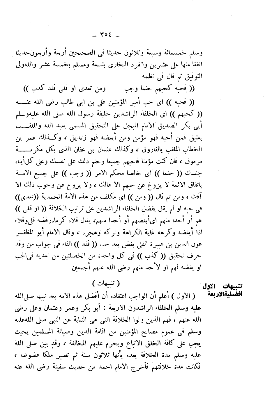 (الْأَوَّلُ) اعْلَمْ أَنَّ الْوَاجِبَ اعْتِقَادُهُ أَنَّ أَفْضَلَ هَذِهِ الْأُمَّةِ بَعْدَ نَبِيِّهَا - صَلَّى اللَّهُ عَلَيْهِ وَسَلَّمَ - الْخُلَفَاءُ الرَّاشِدُونَ الْأَرْبَعَةُ: أَبُو بَكْرٍ وَعُمَرُ وَعُثْمَانُ وَعَلِيٌّ - رَضِيَ اللَّهُ عَنْهُمْ -، فَهُمُ الَّذِينَ وُلُّوا الْخِلَافَةَ الَّتِي هِيَ النِّيَابَةُ عَنِ النَّبِيِّ - صَلَّى اللَّهُ عَلَيْهِ وَسَلَّمَ - فِي عُمُومِ مَصَالِحِ الْمُؤْمِنِينَ مِنْ إِقَامَةِ الدِّينِ وَصِيَانَةِ الْمُسْلِمِينَ بِحَيْثُ يَجِبُ عَلَى كَافَّةِ الْخَلْقِ الِاتِّبَاعُ وَيَحْرُمُ عَلَيْهِمُ الْمُخَالَفَةُ، وَقَدْ بَيَّنَ - صَلَّى اللَّهُ عَلَيْهِ وَسَلَّمَ - مُدَّةَ الْخِلَافَةِ بَعْدَهُ بِأَنَّهَا ثَلَاثُونَ سَنَةً ثُمَّ تَصِيرُ مُلْكًا عَضُوضًا، فَكَانَتْ مُدَّةُ خِلَافَتِهِمْ، فَأَخْرَجَ الْإِمَامُ أَحْمَدُ مِنْ حَدِيثِ سَفِينَةَ - رَضِيَ اللَّهُ عَنْهُ -
