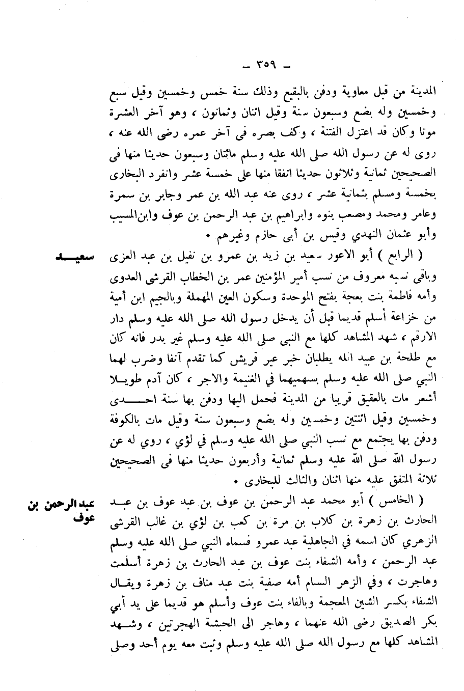 (الرَّابِعُ) أَبُو الْأَعْوَرِ سَعِيدُ بْنُ زَيْدِ بْنِ عَمْرِو بْنِ نُفَيْلِ بْنِ عَبْدِ الْعُزَّى، وَبَاقِي نَسَبِهِ مَعْرُوفٌ مِنْ نَسَبِ أَمِيرِ الْمُؤْمِنِينَ عُمَرَ بْنِ الْخَطَّابِ الْقُرَشِيِّ الْعَدَوِيِّ، وَأُمُّهُ فَاطِمَةُ بِنْتُ بَعْجَةَ - بِفَتْحِ الْمُوَحَّدَةِ وَسُكُونِ الْعَيْنِ الْمُهْمَلَةِ وَبِالْجِيمِ - ابْنِ أُمَيَّةَ مِنْ خُزَاعَةَ، أَسْلَمَ قَدِيمًا مِنْ قَبْلِ أَنْ يَدْخُلَ رَسُولُ اللَّهِ - صَلَّى اللَّهُ عَلَيْهِ وَسَلَّمَ - دَارَ الْأَرْقَمِ، شَهِدَ الْمَشَاهِدَ كُلَّهَا مَعَ النَّبِيِّ - صَلَّى اللَّهُ عَلَيْهِ وَسَلَّمَ - غَيْرَ بَدْرٍ فَإِنَّهُ كَانَ مَعَ طَلْحَةَ بْنِ عُبَيْدِ اللَّهِ يَطْلُبَانِ خَبَرَ عِيرِ قُرَيْشٍ كَمَا تَقَدَّمَ آنِفًا، وَضَرَبَ الرَّسُولُ - صَلَّى اللَّهُ عَلَيْهِ وَسَلَّمَ - بِسَهْمَيْهِمَا فِي الْغَنِيمَةِ وَالْأَجْرِ، كَانَ آدَمَ طَوِيلًا أَشْعَرَ، مَاتَ بِالْعَقِيقِ قَرِيبًا مِنَ الْمَدِينَةِ، فَحُمِلَ إِلَيْهَا وَدُفِنَ بِهَا سَنَةَ إِحْدَى وَخَمْسِينَ وَقِيلَ: اثْنَتَيْنِ وَخَمْسِينَ، وَلَهُ بِضْعٌ وَسَبْعُونَ سَنَةً، وَقِيلَ: مَاتَ بِالْكُوفَةِ وَدُفِنَ بِهَا، يَجْتَمِعُ مَعَ نَسَبِ النَّبِيِّ - صَلَّى اللَّهُ عَلَيْهِ وَسَلَّمَ - فِي لُؤَيٍّ، رُوِيَ لَهُ عَنْ رَسُولِ اللَّهِ - صَلَّى اللَّهُ عَلَيْهِ وَسَلَّمَ - ثَمَانِيَةٌ وَأَرْبَعُونَ حَدِيثًا، مِنْهَا فِي الصَّحِيحَيْنِ ثَلَاثَةٌ، الْمُتَّفَقُ عَلَيْهِ مِنْهَا اثْنَانِ، وَالثَّالِثُ لِلْبُخَارِيِّ.