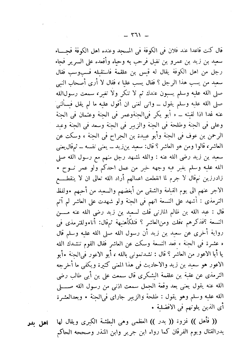 قَالَ: كُنْتُ قَاعِدًا عِنْدَ فُلَانٍ فِي الْكُوفَةِ فِي الْمَسْجِدِ، وَعِنْدَهُ أَهْلُ الْكُوفَةِ، فَجَاءَ سَعِيدُ بْنُ زَيْدِ بْنِ عَمْرِو بْنِ نُفَيْلٍ، فَرَحَّبَ بِهِ وَحَيَّاهُ وَأَقْعَدَهُ عَلَى السَّرِيرِ، فَجَاءَ رَجُلٌ مِنْ أَهْلِ الْكُوفَةِ يُقَالُ لَهُ قَيْسُ بْنُ عَلْقَمَةَ، فَاسْتَقْبَلَهُ فَسَبَّ وَسَبَّ، فَقَالَ سَعِيدٌ: مَنْ يَسُبُّ هَذَا الرَّجُلُ؟ فَقَالَ: يَسُبُّ عَلِيًّا. فَقَالَ: لَا أَرَى أَصْحَابَ النَّبِيِّ - صَلَّى اللَّهُ عَلَيْهِ وَسَلَّمَ - يُسَبُّونَ عِنْدَكَ ثُمَّ لَا تُنْكِرُ وَلَا تُغَيِّرُ، سَمِعْتُ رَسُولَ اللَّهِ - صَلَّى اللَّهُ عَلَيْهِ وَسَلَّمَ - يَقُولُ - وَإِنِّي لَغَنِيٌّ أَنْ أَقُولَ عَلَيْهِ مَا لَمْ يَقُلْ فَيَسْأَلُنِي عَنْهُ غَدًا إِذَا لَقِيتُهُ -: " «أَبُو بَكْرٍ فِي الْجَنَّةِ، وَعُمَرُ فِي الْجَنَّةِ، وَعُثْمَانُ فِي الْجَنَّةِ، وَعَلِيٌّ فِي الْجَنَّةِ، وَطَلْحَةُ فِي الْجَنَّةِ، وَالزُّبَيْرُ فِي الْجَنَّةِ، وَسَعْدٌ فِي الْجَنَّةِ، وَعَبْدُ الرَّحْمَنِ بْنُ عَوْفٍ فِي الْجَنَّةِ، وَأَبُو عُبَيْدَةَ بْنُ الْجَرَّاحِ فِي الْجَنَّةِ» ". وَسَكَتَ عَنِ الْعَاشِرِ، قَالُوا وَمَنْ هُوَ الْعَاشِرُ؟ قَالَ: سَعِيدُ بْنُ زَيْدٍ - يَعْنِي نَفْسَهُ - ثُمَّ قَالَ: يَعْنِي سَعِيدَ بْنَ زَيْدٍ - رَضِيَ اللَّهُ عَنْهُ -: وَاللَّهِ لَمَشْهَدُ رَجُلٍ مِنْهُمْ مَعَ رَسُولِ اللَّهِ - صَلَّى اللَّهُ عَلَيْهِ وَسَلَّمَ - يَغْبَرُّ فِيهِ وَجْهُهُ خَيْرٌ مِنْ عَمَلِ أَحَدِكُمْ وَلَوْ عَمَّرَ عُمْرَ نُوحٍ.