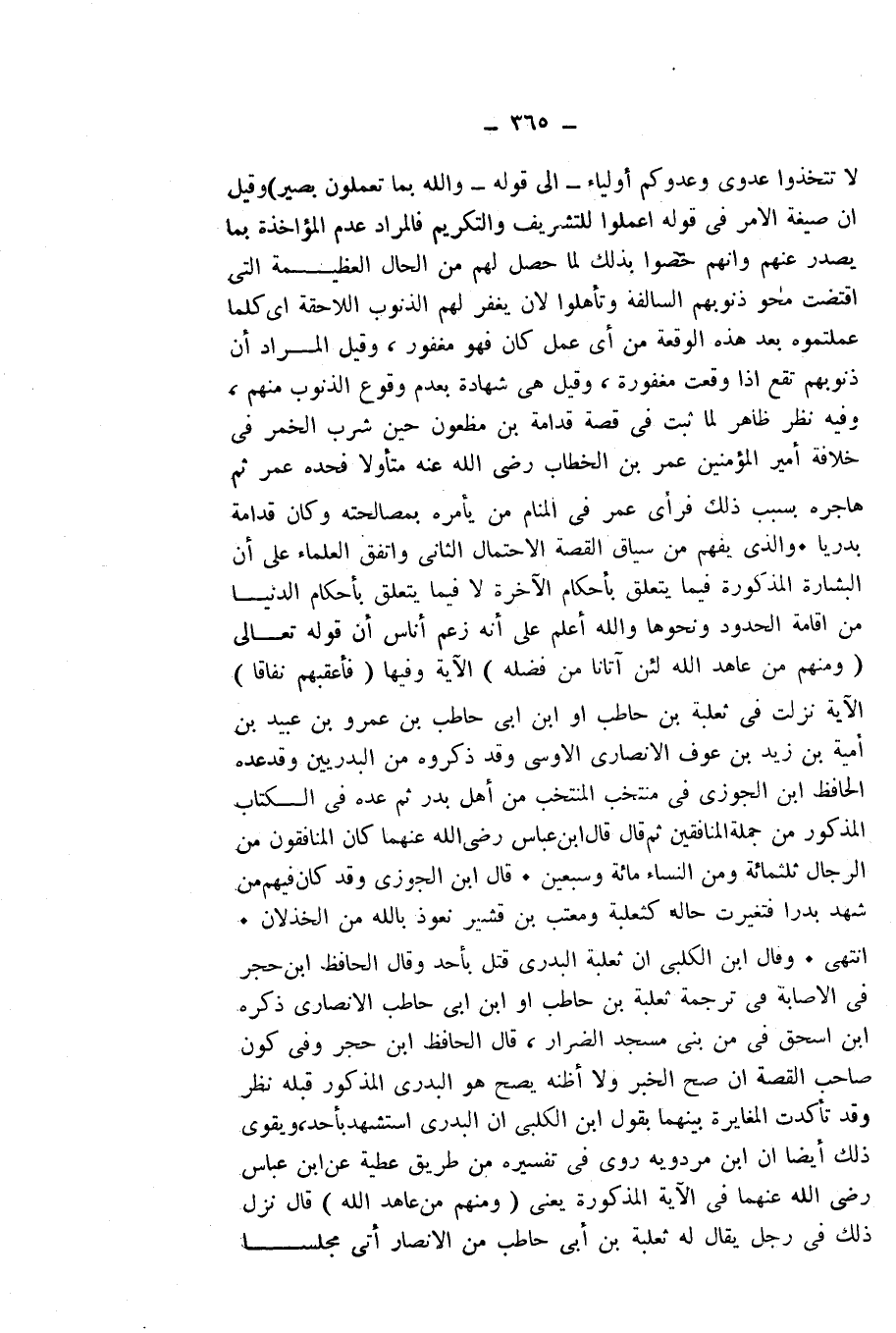 عَلَى أَنَّهُ زَعَمَ أُنَاسٌ أَنَّ قَوْلَهُ تَعَالَى: {وَمِنْهُمْ مَنْ عَاهَدَ اللَّهَ لَئِنْ آتَانَا مِنْ فَضْلِهِ} [التوبة: 75] الْآيَةَ وَفِيهَا {فَأَعْقَبَهُمْ نِفَاقًا} [التوبة: 77] الْآيَةَ نَزَلَتْ فِي ثَعْلَبَةَ بْنِ حَاطِبٍ، أَوِ ابْنِ أَبِي حَاطِبِ بْنِ عَمْرِو بْنِ عُبَيْدِ بْنِ أُمَيَّةَ بْنِ زَيْدِ بْنِ عَوْفٍ الْأَنْصَارِيِّ الْأَوْسِيِّ، وَقَدْ ذَكَرُوهُ مِنَ الْبَدْرِيِّينَ، وَقَدْ عَدَّهُ الْحَافِظُ ابْنُ الْجَوْزِيِّ فِي مُنْتَخَبِ الْمُنْتَخَبِ مِنْ أَهْلِ بَدْرٍ، ثُمَّ عَدَّهُ فِي الْكِتَابِ الْمَذْكُورِ مِنْ جُمْلَةِ الْمُنَافِقِينَ، ثُمَّ قَالَ: قَالَ ابْنُ عَبَّاسٍ - رَضِيَ اللَّهُ عَنْهُمَا -: كَانَ الْمُنَافِقُونَ مِنَ الرِّجَالِ ثَلَاثَمِائَةٍ، وَمِنَ النِّسَاءِ مِائَةٌ وَسَبْعِينَ. وَقَدْ كَانَ فِيهِمْ مَنْ شَهِدَ بَدْرًا فَتَغَيَّرَتْ حَالُهُ كَثَعْلَبَةَ، وَمُعَتِّبِ بْنِ قُشَيْرٍ نَعُوذُ بِاللَّهِ مِنَ الْخِذْلَانِ. انْتَهَى. وَقَالَ ابْنُ الْكَلْبِيِّ: إِنَّ ثَعْلَبَةَ الْبَدْرِيَّ قُتِلَ بِأُحُدٍ، وَقَالَ الْحَافِظُ ابْنُ حَجَرٍ فِي الْإِصَابَةِ فِي تَرْجَمَةِ ثَعْلَبَةَ بْنِ حَاطِبٍ، أَوِ ابْنِ أَبِي حَاطِبٍ الْأَنْصَارِيِّ - ذَكَرَهُ ابْنُ إِسْحَاقَ فِيمَنْ بَنَى مَسْجِدَ الضِّرَارِ - قَالَ الْحَافِظَ ابْنُ حَجَرٍ: وَفِي كَوْنِ صَاحِبِ الْقِصَّةِ - إِنْ صَحَّ الْخَبَرُ، وَلَا أَظُنُّهُ يَصِحُّ - هُوَ الْبَدْرِيَّ الْمَذْكُورَ قَبْلَهُ نَظَرٌ، وَقَدْ تَأَكَّدَتِ الْمُغَايِرَةُ بَيْنَهُمَا بِقَوْلِ ابْنِ الْكَلْبِيِّ إِنَّ الْبَدْرِيَّ اسْتُشْهِدَ بِأُحُدٍ، وَيُقَوِّي ذَلِكَ أَيْضًا أَنَّ ابْنَ مَرْدَوَيْهِ رَوَى فِي تَفْسِيرِهِ مِنْ طَرِيقِ عَطِيَّةَ عَنِ ابْنِ عَبَّاسٍ - رَضِيَ اللَّهُ عَنْهُمَا - فِي الْآيَةِ الْمَذْكُورَةِ يَعْنِي {وَمِنْهُمْ مَنْ عَاهَدَ اللَّهَ} [التوبة: 75] قَالَ: نَزَلَ ذَلِكَ فِي رَجُلٍ يُقَالُ لَهُ ثَعْلَبَةُ بْنُ أَبِي حَاطِبٍ مِنَ الْأَنْصَارِ أَتَى مَجْلِسًا