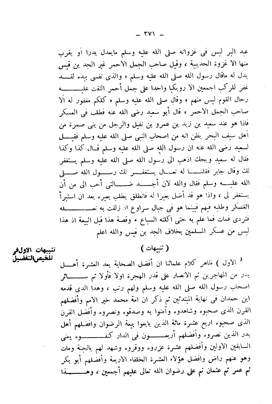 (تَنْبِيهَاتٌ ((الْأَوَّلُ) ظَاهِرُ كَلَامِ عُلَمَائِنَا أَنَّ أَفْضَلَ الصَّحَابَةِ بَعْدَ الْعَشَرَةِ أَهْلُ بَدْرٍ مِنَ الْمُهَاجِرِينَ، ثُمَّ الْأَنْصَارُ عَلَى قَدْرِ الْهِجْرَةِ أَوَّلًا فَأَوَّلًا، ثُمَّ سَائِرُ أَصْحَابِ رَسُولِ اللَّهِ - صَلَّى اللَّهُ عَلَيْهِ وَسَلَّمَ - وَلَهُمْ رُتَبٌ، وَهَذَا الَّذِي قَدَّمَهُ ابْنُ حَمْدَانَ فِي نِهَايَةِ الْمُبْتَدِئِينَ، ثُمَّ ذَكَرَ أَنَّ أُمَّةَ مُحَمَّدٍ خَيْرُ الْأُمَمِ، وَأَفْضَلَهُمُ الْقَرْنُ الَّذِي صَحِبُوهُ وَشَاهَدُوهُ وَآمَنُوا بِهِ وَصَدَّقُوهُ وَنَصَرُوهُ، وَأَفْضَلَ الْقَرْنِ الَّذِي صَحِبُوهُ أَرْبَعَ عَشْرَةَ مِائَةً الَّذِينَ بَايَعُوا بَيْعَةَ الرِّضْوَانِ، وَأَفْضَلَهُمْ أَهْلُ بَدْرٍ الَّذِينَ نَصَرُوهُ، وَأَفْضَلَهُمْ أَرْبَعُونَ فِي الدَّارِ كَنَفُوهُ - يَعْنِي السَّابِقِينَ الْأَوَّلِينَ -، وَأَفْضَلَهُمْ عَشَرَةٌ عَزَّرُوهُ وَوَقَّرُوهُ، وَشَهِدَ لَهُمْ بِالْجَنَّةِ وَمَاتَ وَهُوَ عَنْهُمْ رَاضٍ، وَأَفْضَلَ هَؤُلَاءِ الْعَشَرَةِ الْخُلَفَاءُ الْأَرْبَعَةُ، وَأَفْضَلَهُمْ أَبُو بَكْرٍ ثُمَّ عُمَرُ ثُمَّ عُثْمَانُ ثُمَّ عَلِيٌّ رِضْوَانُ اللَّهِ تَعَالَى عَلَيْهِمْ أَجْمَعِينَ، وَهَذَا