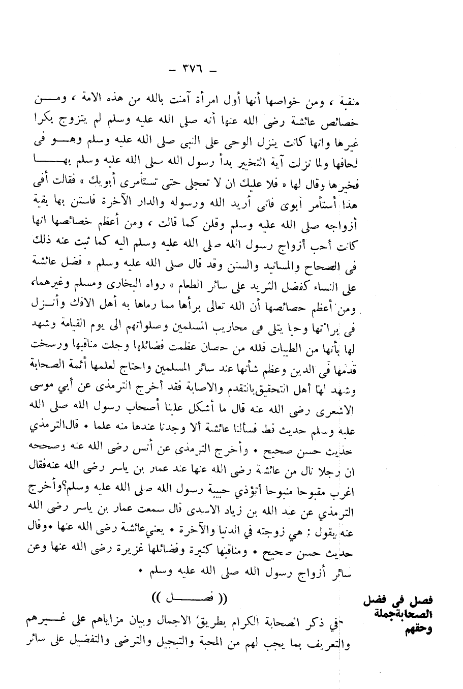 وَمِنْ أَعْظَمِ خَصَائِصِهَا أَنَّ اللَّهَ تَعَالَى بَرَّأَهَا مِمَّا رَمَاهَا بِهِ أَهْلُ الْإِفْكِ، وَأَنْزَلَ فِي بَرَاءَتِهَا وَحْيًا يُتْلَى فِي مَحَارِيبِ الْمُسْلِمِينَ وَصَلَوَاتِهِمْ إِلَى يَوْمِ الْقِيَامَةِ، وَشَهِدَ لَهَا أَنَّهَا مِنَ الطَّيِّبَاتِ، فَلِلَّهِ مِنْ حَصَانٍ عَظُمَتْ فَضَائِلُهَا، وَجَلَّتْ مَنَاقِبُهَا، وَرَسَخَتْ قَدَمُهَا فِي الدِّينِ، وَعَظُمَ شَأْنُهَا عِنْدَ سَائِرِ الْمُسْلِمِينَ، وَاحْتَاجَ لِعِلْمِهَا أَئِمَّةُ الصَّحَابَةِ، وَشَهِدَ لَهَا أَهْلُ التَّحْقِيقِ بِالتَّقَدُّمِ وَالْإِصَابَةِ، فَقَدْ أَخْرَجَ التِّرْمِذِيُّ عَنْ أَبِي مُوسَى الْأَشْعَرِيِّ - رَضِيَ اللَّهُ عَنْهُ - قَالَ: مَا أَشْكَلَ عَلَيْنَا أَصْحَابَ رَسُولِ اللَّهِ - صَلَّى اللَّهُ عَلَيْهِ وَسَلَّمَ - حَدِيثٌ قَطُّ فَسَأَلْنَا عَائِشَةَ إِلَّا وَجَدْنَا عِنْدَهَا مِنْهُ عِلْمًا. قَالَ التِّرْمِذِيُّ: حَدِيثٌ حَسَنٌ صَحِيحٌ. وَأَخْرَجَ التِّرْمِذِيُّ عَنْ أَنَسٍ - رَضِيَ اللَّهُ عَنْهُ - وَصَحَّحَهُ أَنَّ رَجُلًا نَالَ مِنْ عَائِشَةَ - رَضِيَ اللَّهُ عَنْهَا - عِنْدَ عَمَّارِ بْنِ يَاسِرٍ - رَضِيَ اللَّهُ عَنْهُ - فَقَالَ: اغْرُبْ مَقْبُوحًا مَنْبُوحًا أَتُؤْذِي حَبِيبَةَ رَسُولِ اللَّهِ - صَلَّى اللَّهُ عَلَيْهِ وَسَلَّمَ -؟ وَرَوَى التِّرْمِذِيُّ عَنْ عَبْدِ اللَّهِ بْنِ زِيَادٍ الْأَسَدِيِّ قَالَ: سَمِعْتُ عَمَّارَ بْنَ يَاسِرٍ - رَضِيَ اللَّهُ عَنْهُ - يَقُولُ: هِيَ زَوْجَتُهُ فِي الدُّنْيَا وَالْآخِرَةِ. - يَعْنِي عَائِشَةَ رَضِيَ اللَّهُ عَنْهَا -. وَقَالَ: حَدِيثٌ حَسَنٌ صَحِيحٌ. وَمَنَاقِبُهَا كَثِيرَةٌ، وَفَضَائِلُهَا غَزِيرَةٌ رَضِيَ اللَّهُ عَنْهَا، وَعَنْ سَائِرِ أَزْوَاجِ رَسُولِ اللَّهِ - صَلَّى اللَّهُ عَلَيْهِ وَسَلَّمَ -.