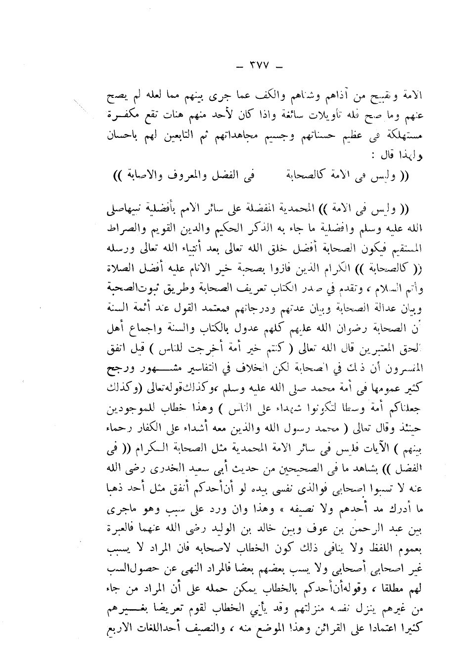 ((وَلَيْسَ فِي الْأُمَّةِ)) الْمُحَمَّدِيَّةِ الْمُفَضَّلَةِ عَلَى سَائِرِ الْأُمَمِ بِأَفْضَلِيَّةِ نَبِيِّهَا - صَلَّى اللَّهُ عَلَيْهِ وَسَلَّمَ -، وَأَفْضَلِيَّةِ مَا جَاءَ بِهِ الذِّكْرُ الْحَكِيمُ، وَالدِّينُ الْقَوِيمُ، وَالصِّرَاطُ الْمُسْتَقِيمُ، فَيَكُونُ الصَّحَابَةُ أَفْضَلَ خَلْقِ اللَّهِ تَعَالَى بَعْدَ أَنْبِيَاءِ اللَّهِ تَعَالَى وَرُسُلِهِ، ((كَالصَّحَابَةِ)) الْكِرَامِ الَّذِينَ فَازُوا بِصُحْبَةِ خَيْرِ الْأَنَامِ عَلَيْهِ أَفْضَلُ الصَّلَاةِ وَأَتَمُّ السَّلَامِ، وَتَقَدَّمَ فِي صَدْرِ الْكِتَابِ تَعْرِيفُ الصَّحَابَةِ، وَطَرِيقُ ثُبُوتِ الصُّحْبَةِ، وَبَيَانُ عَدَالَةِ الصَّحَابَةِ، وَبَيَانُ عِدَّتِهِمْ وَدَرَجَاتِهِمْ، فَمُعْتَمَدُ الْقَوْلِ عِنْدَ أَئِمَّةِ السُّنَّةِ أَنَّ الصَّحَابَةَ - رِضْوَانُ اللَّهِ عَلَيْهِمْ - كُلُّهُمْ عُدُولٌ بِالْكِتَابِ وَالسُّنَّةِ وَإِجْمَاعِ أَهْلِ الْحَقِّ الْمُعْتَبَرِينَ، قَالَ اللَّهُ تَعَالَى: {كُنْتُمْ خَيْرَ أُمَّةٍ أُخْرِجَتْ لِلنَّاسِ} [آل عمران: 110] قِيلَ: اتَّفَقَ الْمُفَسِّرُونَ أَنَّ ذَلِكَ فِي الصَّحَابَةِ، لَكِنَّ الْخِلَافَ فِي التَّفَاسِيرِ مَشْهُورٌ، وَرَجَّحَ كَثِيرٌ عُمُومَهَا فِي أُمَّةِ مُحَمَّدٍ - صَلَّى اللَّهُ عَلَيْهِ وَسَلَّمَ -، وَكَذَلِكَ قَوْلُهُ تَعَالَى: {وَكَذَلِكَ جَعَلْنَاكُمْ أُمَّةً وَسَطًا لِتَكُونُوا شُهَدَاءَ عَلَى النَّاسِ} [البقرة: 143] وَهَذَا خِطَابٌ لِلْمَوْجُودِينَ حِينَئِذٍ، وَقَالَ تَعَالَى: {مُحَمَّدٌ رَسُولُ اللَّهِ وَالَّذِينَ مَعَهُ أَشِدَّاءُ عَلَى الْكُفَّارِ رُحَمَاءُ بَيْنَهُمْ} [الفتح: 29] الْآيَاتِ، فَلَيْسَ فِي سَائِرِ الْأُمَّةِ الْمُحَمَّدِيَّةِ مِثْلُ الصَّحَابَةِ الْكِرَامِ، ((فِي الْفَضْلِ)) بِشَاهِدِ مَا فِي الصَّحِيحَيْنِ مِنْ حَدِيثِ أَبِي سَعِيدٍ الْخُدْرِيِّ - رَضِيَ اللَّهُ عَنْهُ -: " «لَا تَسُبُّوا أَصْحَابِي، فَوَالَّذِي نَفْسِي بِيَدِهِ لَوْ أَنَّ أَحَدَكُمْ أَنْفَقَ مِثْلَ أُحُدٍ ذَهَبًا مَا أَدْرَكَ مُدَّ أَحَدِهِمْ وَلَا نَصِيفَهُ» ". وَهَذَا وَإِنْ وَرَدَ عَلَى سَبَبٍ، وَهُوَ مَا جَرَى بَيْنَ عَبْدِ الرَّحْمَنِ بْنِ عَوْفٍ وَبَيْنَ خَالِدِ بْنِ الْوَلِيدِ - رَضِيَ اللَّهُ عَنْهُمَا -، فَالْعِبْرَةُ بِعُمُومِ اللَّفْظِ، وَلَا يُنَافِي ذَلِكَ كَوْنَ الْخِطَابِ لِأَصْحَابِهِ، فَإِنَّ الْمُرَادَ لَا يَسُبُّ غَيْرُ أَصْحَابِي أَصْحَابِي، وَلَا يَسُبُّ بَعْضُهُمْ بَعْضًا، فَالْمُرَادُ النَّهْيُ عَنْ حُصُولِ السَّبِّ لَهُمْ مُطْلَقًا، وَقَوْلُهُ: إِنَّ أَحَدَكُمْ بِالْخِطَابِ يُمْكِنُ حَمْلُهُ عَلَى أَنَّ الْمُرَادَ مَنْ جَاءَ مِنْ غَيْرِهِمْ يُنْزِلُ نَفْسَهُ مَنْزِلَتَهُمْ، وَقَدْ يَأْتِي الْخِطَابُ لِقَوْمٍ تَعْرِيضًا بِغَيْرِهِمْ كَثِيرًا اعْتِمَادًا عَلَى الْقَرَائِنِ وَهَذَا الْمَوْضِعُ مِنْهُ، وَالنَّصِيفُ أَحَدُ اللُّغَاتِ الْأَرْبَعِ
