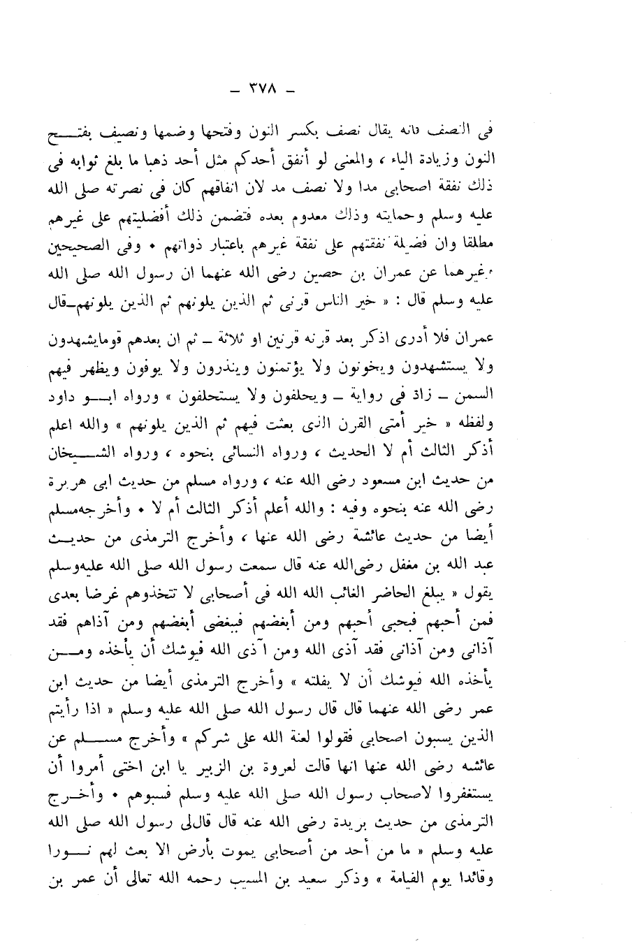 فِي النِّصْفِ، فَإِنَّهُ يُقَالُ: نَصِفٌ بِكَسْرِ النُّونِ وَفَتْحِهَا وَضَمِّهَا وَنَصِيفٌ بِفَتْحِ النُّونِ وَزِيَادَةِ الْيَاءِ، وَالْمَعْنَى لَوْ أَنْفَقَ أَحَدُكُمْ مِثْلَ أُحُدٍ ذَهَبًا مَا بَلَغَ ثَوَابُهُ فِي ذَلِكَ نَفَقَةَ أَصْحَابِي فِي مُدٍّ وَلَا نِصْفِ مُدٍّ، لِأَنَّ إِنْفَاقَهُمْ كَانَ فِي نُصْرَتِهِ - صَلَّى اللَّهُ عَلَيْهِ وَسَلَّمَ - وَحِمَايَتِهِ، وَذَلِكَ مَعْدُومٌ بَعْدَهُ، فَتَضَمَّنَ ذَلِكَ أَفْضَلِيَّتَهُمْ عَلَى غَيْرِهِمْ مُطْلَقًا، وَأَنَّ فَضِيلَةَ نَفَقَتِهِمْ عَلَى نَفَقَةِ غَيْرِهِمْ بِاعْتِبَارِ ذَوَاتِهِمْ. وَفِي الصَّحِيحَيْنِ وَغَيْرِهِمَا عَنْ عِمْرَانَ بْنِ حُصَيْنٍ - رَضِيَ اللَّهُ عَنْهُمَا - أَنَّ رَسُولَ اللَّهِ - صَلَّى اللَّهُ عَلَيْهِ وَسَلَّمَ - قَالَ: " «خَيْرُ النَّاسِ قَرْنِي ثُمَّ الَّذِينَ يَلُونَهُمْ - قَالَ عِمْرَانُ: فَلَا أَدْرِي أَذَكَرَ بَعْدَ قَرْنِهِ قَرْنَيْنِ أَوْ ثَلَاثَةً - ثُمَّ إِنَّ بَعْدَهُمْ قَوْمٌ يَشْهَدُونَ وَلَا يُسْتَشْهَدُونَ، وَيَخُونُونَ وَلَا يُؤْتَمَنُونَ، وَيُنْذِرُونَ وَلَا يُوفُونَ، وَيَظْهَرُ فِيهِمُ السِّمَنُ - زَادَ فِي رِوَايَةٍ -، وَيَحْلِفُونَ وَلَا يُسْتَحْلَفُونَ» ". وَرَوَاهُ أَبُو دَاوُدَ وَلَفْظُهُ: " «خَيْرُ أُمَّتِي الَّذِي بُعِثْتُ فِيهِمْ ثُمَّ الَّذِينَ يَلُونَهُمْ» " وَاللَّهُ أَعْلَمُ. أَذَكَرَ الثَّالِثَ أَمْ لَا، الْحَدِيثَ، وَرَوَاهُ النَّسَائِيُّ بِنَحْوِهِ، وَرَوَاهُ الشَّيْخَانِ مِنْ حَدِيثِ ابْنِ مَسْعُودٍ - رَضِيَ اللَّهُ عَنْهُ -، وَرَوَاهُ مُسْلِمٌ مِنْ حَدِيثِ أَبِي هُرَيْرَةَ - رَضِيَ اللَّهُ عَنْهُ - بِنَحْوِهِ وَفِيهِ: وَاللَّهُ أَعْلَمُ أَذَكَرَ الثَّالِثَ أَمْ لَا. وَأَخْرَجَهُ مُسْلِمٌ أَيْضًا مِنْ حَدِيثِ عَائِشَةَ - رَضِيَ اللَّهُ عَنْهَا -.