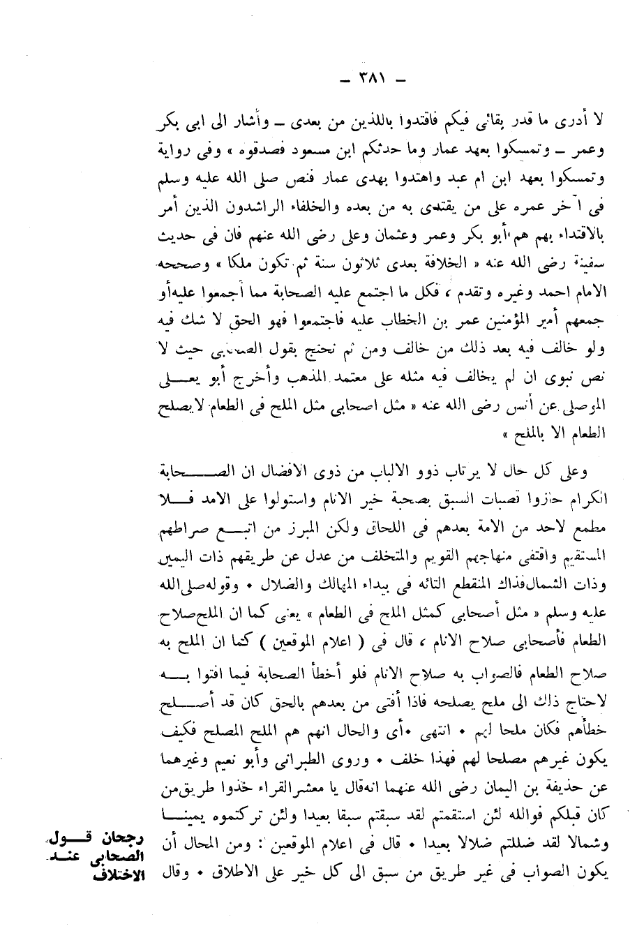 لَا أَدْرِي مَا قَدْرُ بَقَائِي فِيكُمْ، فَاقْتَدُوا بِالَّذَيْنِ مِنْ بَعْدِي، - وَأَشَارَ إِلَى أَبِي بَكْرٍ وَعُمَرَ - وَتَمَسَّكُوا بِعَهْدِ عَمَّارٍ، وَمَا حَدَّثَكُمُ ابْنُ مَسْعُودٍ فَصَدِّقُوهُ» ". وَفِي رِوَايَةٍ «وَتَمَسَّكُوا بِعَهْدِ ابْنِ أُمِّ عَبْدٍ، وَاهْتَدُوا بِهَدْيِ عَمَّارٍ» ، فَنَصَّ - صَلَّى اللَّهُ عَلَيْهِ وَسَلَّمَ - فِي آخِرِ عُمْرِهِ عَلَى مَنْ يُقْتَدَى بِهِ مِنْ بَعْدِهِ، وَالْخُلَفَاءُ الرَّاشِدُونَ الَّذِينَ أَمَرَ بِالِاقْتِدَاءِ بِهِمْ هُمْ أَبُو بَكْرٍ وَعُمَرُ وَعُثْمَانُ وَعَلِيٌّ - رَضِيَ اللَّهُ عَنْهُمْ -، فَإِنَّ فِي حَدِيثِ سَفِينَةَ - رَضِيَ اللَّهُ عَنْهُ -: " «الْخِلَافَةُ بَعْدِي ثَلَاثِينَ سَنَةً ثُمَّ تَكُونُ مُلْكًا» ". وَصَحَّحَهُ الْإِمَامُ أَحْمَدُ وَغَيْرُهُ وَتَقَدَّمَ، فَكُلُّ مَا اجْتَمَعَ عَلَيْهِ الصَّحَابَةُ مِمَّا أَجْمَعُوا عَلَيْهِ، أَوْ جَمَعَهُمْ أَمِيرُ الْمُؤْمِنِينَ عُمَرُ بْنُ الْخَطَّابِ عَلَيْهِ فَاجْتَمِعُوا فَهُوَ الْحَقُّ لَا شَكَّ فِيهِ، وَلَوْ خَالَفَ فِيهِ مِنْ بَعْدِ ذَلِكَ مَنْ خَالَفَ، وَمِنْ ثَمَّ نَحْتَجُّ بِقَوْلِ الصَّحَابِيِّ حَيْثُ لَا نَصَّ نَبَوِيَّ، إِنْ لَمْ يُخَالِفْ فِيهِ مِثْلَهُ عَلَى مُعْتَمَدِ الْمَذْهَبِ، وَأَخْرَجَ أَبُو يَعْلَى الْمَوْصِلِيُّ عَنْ أَنَسٍ - رَضِيَ اللَّهُ عَنْهُ -: " «مَثَلُ أَصْحَابِي مَثَلُ الْمِلْحِ فِي الطَّعَامِ لَا يَصْلُحُ الطَّعَامُ إِلَّا بِالْمِلْحِ» ".