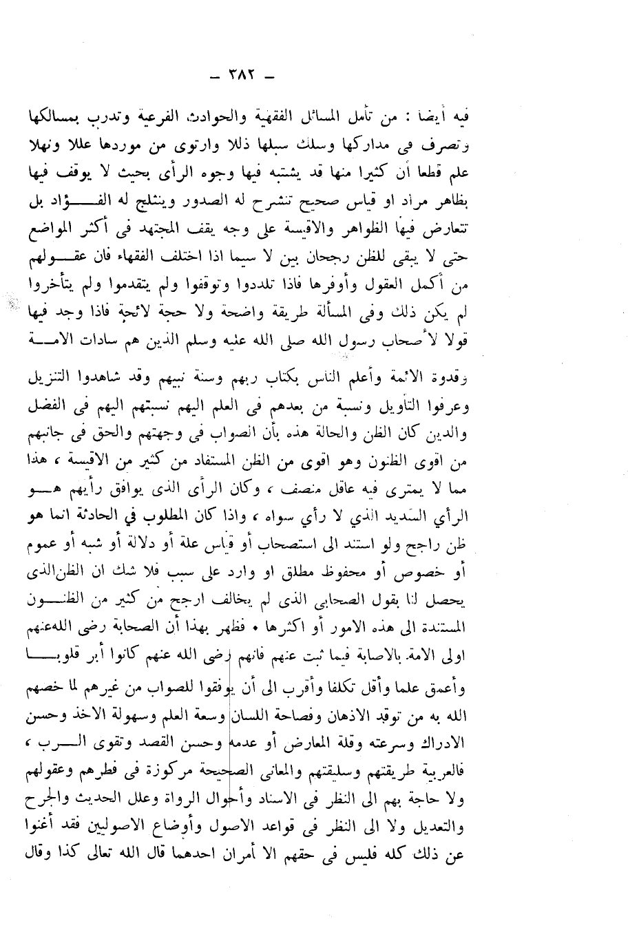 فِيهِ أَيْضًا: مَنْ تَأَمَّلَ الْمَسَائِلَ الْفِقْهِيَّةَ، وَالْحَوَادِثَ الْفَرْعِيَّةَ، وَتَدَرَّبَ بِمَسَالِكِهَا، وَتَصَرَّفَ فِي مَدَارِكِهَا وَسَلَكَ سُبُلَهَا ذُلُلًا، وَارْتَوَى مِنْ مَوْرِدِهَا عَلَلًا وَنَهَلًا، عَلِمَ قَطْعًا أَنَّ كَثِيرًا مِنْهَا قَدْ يَشْتَبِهُ فِيهَا وُجُوهُ الرَّأْيِ، بِحَيْثُ لَا يُوقَفُ فِيهَا بِظَاهِرٍ مُرَادٍ، أَوْ قِيَاسٍ صَحِيحٍ تَنْشَرِحُ لَهُ الصُّدُورُ، وَيَنْثَلِجُ لَهُ الْفُؤَادُ، بَلْ تَتَعَارَضُ فِيهَا الظَّوَاهِرُ وَالْأَقْيِسَةُ عَلَى وَجْهٍ يَقِفُ الْمُجْتَهِدُ فِي أَكْثَرِ الْمَوَاضِعِ حَتَّى لَا يَبْقَى لِلظَّنِّ رُجْحَانٌ بَيِّنٌ، لَا سِيَّمَا إِذَا اخْتَلَفَ الْفُقَهَاءُ، فَإِنَّ عُقُولَهُمْ مِنْ أَكْمَلِ الْعُقُولِ وَأَوْفَرِهَا، فَإِذَا تَلَدَّدُوا وَتَوَقَّفُوا، وَلَمْ يَتَقَدَّمُوا وَلَمْ يَتَأَخَّرُوا لَمْ يَكُنْ ذَلِكَ وَفِي الْمَسْأَلَةِ طَرِيقَةٌ وَاضِحَةٌ، وَلَا حُجَّةٌ لَائِحَةٌ، فَإِذَا وَجَدَ فِيهَا قَوْلًا لِأَصْحَابِ رَسُولِ اللَّهِ - صَلَّى اللَّهُ عَلَيْهِ وَسَلَّمَ - الَّذِينَ هُمْ سَادَاتُ الْأُمَّةِ، وَقُدْوَةُ الْأَئِمَّةِ، وَأَعْلَمُ النَّاسِ بِكِتَابِ رَبِّهِمْ، وَسُنَّةِ نَبِيِّهِمْ، وَقَدْ شَاهَدُوا التَّنْزِيلَ، وَعَرَفُوا التَّأْوِيلَ، وَنِسْبَةُ مَنْ بَعْدَهُمْ فِي الْعِلْمِ إِلَيْهِمْ نِسْبَتُهُمْ إِلَيْهِمْ فِي الْفَضْلِ وَالدِّينِ، كَانَ الظَّنُّ وَالْحَالَةُ هَذِهِ بِأَنَّ الصَّوَابَ فِي وُجْهَتِهِمْ، وَالْحَقُّ فِي جَانِبِهِمْ مِنْ أَقْوَى الظُّنُونِ، وَهُوَ أَقْوَى مِنَ الظَّنِّ الْمُسْتَفَادِ مِنْ كَثِيرٍ مِنَ الْأَقْيِسَةِ، هَذَا مِمَّا لَا يَمْتَرِي فِيهِ عَاقِلٌ مُنْصِفٌ، وَكَانَ الرَّأْيُ الَّذِي يُوَافِقُ رَأْيَهُمْ هُوَ الرَّأْيُ السَّدِيدُ الَّذِي لَا رَأْيَ سِوَاهُ، وَإِذَا كَانَ الْمَطْلُوبُ فِي الْحَادِثَةِ إِنَّمَا هُوَ ظَنٌّ رَاجِحٌ، وَلَوِ اسْتَنَدَ إِلَى اسْتِصْحَابٍ، أَوْ قِيَاسِ عِلَّةٍ، أَوْ دَلَالَةٍ، أَوْ شَبَهٍ، أَوْ عُمُومٍ، أَوْ خُصُوصٍ، أَوْ مَحْفُوظٍ مُطْلَقٍ، أَوْ وَارِدٍ عَلَى سَبَبٍ، فَلَا شَكَّ أَنَّ الظَّنَّ الَّذِي يَحْصُلُ لَنَا بِقَوْلِ الصَّحَابِيِّ الَّذِي لَمْ يُخَالِفْ، أَرْجَحُ مِنْ كَثِيرٍ مِنَ الظُّنُونِ الْمُسْتَنِدَةِ إِلَى هَذِهِ الْأُمُورِ أَوْ أَكْثَرِهَا.