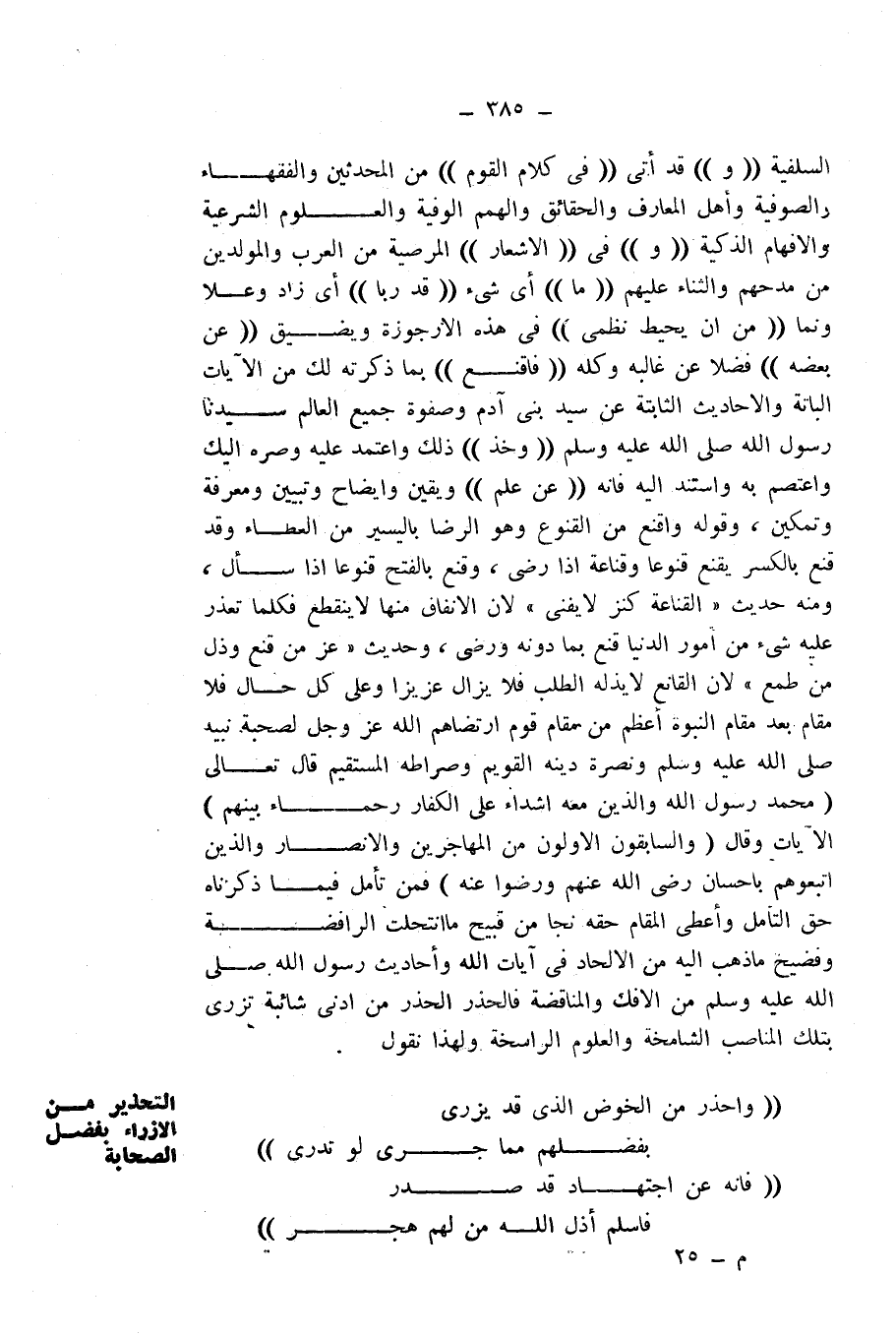 السَّلَفِيَّةِ ((وَ)) قَدْ أَتَى ((فِي كَلَامِ الْقَوْمِ)) مِنَ الْمُحَدِّثِينَ وَالْفُقَهَاءِ وَالصُّوفِيَّةِ وَأَهْلِ الْمَعَارِفِ وَالْحَقَائِقِ وَالْهِمَمِ الْوَافِيَةِ وَالْعُلُومِ الشَّرْعِيَّةِ وَالْأَفْهَامِ الذَّكِيَّةِ، ((وَ)) فِي ((الْأَشْعَارِ)) الْمَرْضِيَّةِ مِنَ الْعَرَبِ وَالْمُوَلَّدِينَ مِنْ مَدْحِهِمْ وَالثَّنَاءِ عَلَيْهِمْ ((مَا)) أَيْ شَيْءٌ ((قَدْ رَبَا)) أَيْ زَادَ وَعَلَا وَنَمَا ((مِنْ أَنْ يُحِيطَ نَظْمِي)) فِي هَذِهِ الْأُرْجُوزَةِ، وَيَضِيقَ ((عَنْ بَعْضِهِ)) فَضْلًا عَنْ غَالِبِهِ وَكُلِّهِ، ((فَاقْنَعْ)) بِمَا ذَكَرْتُهُ لَكَ مِنَ الْآيَاتِ الْبَاتَّةِ وَالْأَحَادِيثِ الثَّابِتَةِ عَنْ سَيِّدِ بَنِي آدَمَ، وَصَفْوَةِ جَمِيعِ الْعَالَمِ سَيِّدِنَا رَسُولِ اللَّهِ - صَلَّى اللَّهُ عَلَيْهِ وَسَلَّمَ -، ((وَخُذْ)) ذَلِكَ وَاعْتَمِدْ عَلَيْهِ وَصُرَّهُ إِلَيْكَ وَاعْتَصِمْ بِهِ وَاسْتَنِدْ إِلَيْهِ، فَإِنَّهُ ((عَنْ عَلْمٍ)) وَيَقِينٍ وَإِيضَاحٍ وَتَبْيِينٍ وَمَعْرِفَةٍ وَتَمْكِينٍ، وَقَوْلُهُ: وَاقْنَعْ مِنَ الْقَنُوعِ، وَهُوَ الرِّضَا بِالْيَسِيرِ مِنَ الْعَطَاءِ، وَقَدْ قَنِعَ بِالْكَسْرِ يَقْنَعُ قُنُوعًا وَقَنَاعَةً إِذَا رَضِيَ، وَقَنَعَ بِالْفَتْحِ قُنُوعًا إِذَا سَأَلَ، وَمِنْهُ حَدِيثُ: " «الْقَنَاعَةُ كَنْزٌ لَا يَفْنَى» ". لِأَنَّ الْإِنْفَاقَ مِنْهَا لَا يَنْقَطِعُ، فَكُلَّمَا تَعَذَّرَ عَلَيْهِ شَيْءٌ مِنْ أُمُورِ الدُّنْيَا قَنِعَ بِمَا دُونَهُ وَرَضِيَ، وَحَدِيثُ: " «عَزَّ مَنْ قَنِعَ وَذَلَّ مَنْ طَمَعَ» ". لِأَنَّ الْقَانِعَ لَا يُذِلُّهُ الطَّلَبُ، فَلَا يَزَالُ عَزِيزًا، وَعَلَى كُلِّ حَالٍ فَلَا مَقَامَ بَعْدَ مَقَامِ النُّبُوَّةِ أَعْظَمُ مِنْ مَقَامِ قَوْمٍ ارْتَضَاهُمُ اللَّهُ - عَزَّ وَجَلَّ - لِصُحْبَةِ نَبِيِّهِ - صَلَّى اللَّهُ عَلَيْهِ وَسَلَّمَ -، وَنُصْرَةِ دِينِهِ الْقَوِيمِ، وَصِرَاطِهِ الْمُسْتَقِيمِ، قَالَ تَعَالَى: {مُحَمَّدٌ رَسُولُ اللَّهِ وَالَّذِينَ مَعَهُ أَشِدَّاءُ عَلَى الْكُفَّارِ رُحَمَاءُ بَيْنَهُمْ} [الفتح: 29] الْآيَاتِ، وَقَالَ: {وَالسَّابِقُونَ الْأَوَّلُونَ مِنَ الْمُهَاجِرِينَ وَالْأَنْصَارِ وَالَّذِينَ اتَّبَعُوهُمْ بِإِحْسَانٍ رَضِيَ اللَّهُ عَنْهُمْ وَرَضُوا عَنْهُ} [التوبة: 100] فَمَنْ تَأَمَّلَ فِيمَا ذَكَرْنَاهُ حَقَّ التَّأَمُّلِ، وَأَعْطَى الْمَقَامَ حَقَّهُ نَجَا مِنْ قَبِيحِ مَا انْتَحَلَتِ الرَّافِضَةُ، وَفَضِيحِ مَا ذَهَبَ إِلَيْهِ الْإِلْحَادُ فِي آيَاتِ اللَّهِ، وَأَحَادِيثِ رَسُولِ اللَّهِ - صَلَّى اللَّهُ عَلَيْهِ وَسَلَّمَ - مِنَ الْإِفْكِ وَالْمُنَاقَضَةِ، فَالْحَذَرَ الْحَذَرَ مِنْ أَدْنَى شَائِبَةٍ تُزْرِي بِتِلْكَ الْمَنَاصِبِ الشَّامِخَةِ، وَالْعُلُومِ الرَّاسِخَةِ، وَلِهَذَا نَقُولُ:
