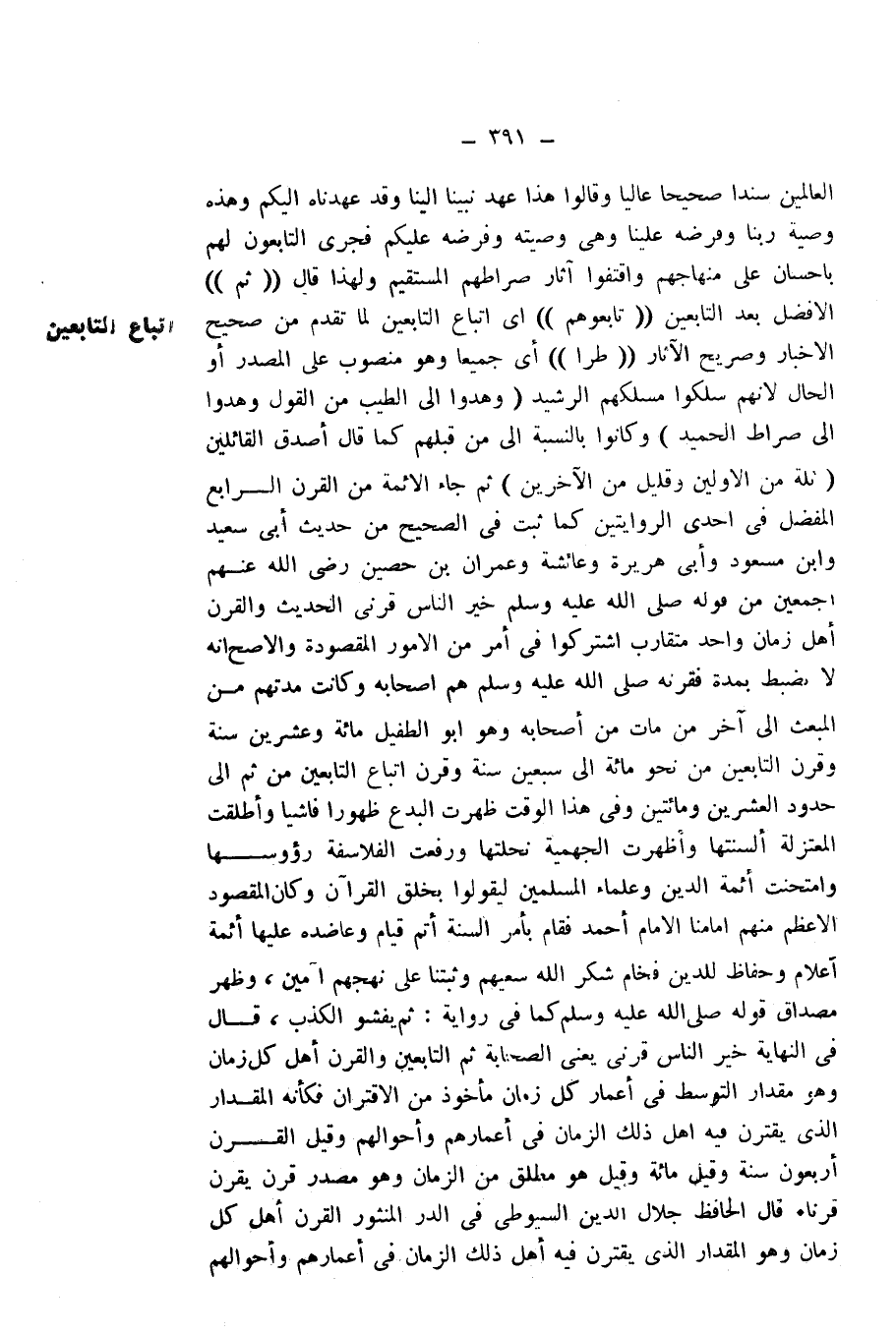 الْعَالَمِينَ سَنَدًا صَحِيحًا عَالِيًا، وَقَالُوا: هَذَا عَهْدُ نَبِيِّنَا إِلَيْنَا، وَقَدْ عَهِدْنَاهُ إِلَيْكُمْ، وَهَذِهِ وَصِيَّةُ رَبِّنَا وَفَرْضِهِ عَلَيْنَا، وَهِيَ وَصِيَّتُهُ وَفَرْضُهُ عَلَيْكُمْ، فَجَرَى التَّابِعُونَ لَهُمْ بِإِحْسَانٍ عَلَى مِنْهَاجِهِمْ، وَاقْتَفَوْا آثَارَ صِرَاطِهِمُ الْمُسْتَقِيمِ، وَلِهَذَا قَالَ ((ثُمَّ)) الْأَفْضَلُ بَعْدَ التَّابِعِينَ ((تَابِعُوهُمْ)) أَيْ أَتْبَاعُ التَّابِعِينَ، لِمَا تَقَدَّمَ مِنْ صَحِيحِ الْأَخْبَارِ وَصَرِيحِ الْآثَارِ ((طُرًّا)) أَيْ جَمِيعًا، وَهُوَ مَنْصُوبٌ عَلَى الْمَصْدَرِ أَوِ الْحَالِ، لِأَنَّهُمْ سَلَكُوا مَسْلَكَهُمُ الرَّشِيدَ {وَهُدُوا إِلَى الطَّيِّبِ مِنَ الْقَوْلِ وَهُدُوا إِلَى صِرَاطِ الْحَمِيدِ} [الحج: 24] وَكَانُوا بِالنِّسْبَةِ إِلَى مَنْ قَبْلَهُمْ كَمَا قَالَ أَصْدَقُ الْقَائِلِينَ: {ثُلَّةٌ مِنَ الْأَوَّلِينَ - وَقَلِيلٌ مِنَ الْآخِرِينَ} [الواقعة: 13 - 14] ، ثُمَّ جَاءَ الْأَئِمَّةُ مِنَ الْقَرْنِ الرَّابِعِ الْمُفَضَّلِ فِي إِحْدَى الرِّوَايَتَيْنِ، كَمَا ثَبَتَ فِي الصَّحِيحِ مِنْ حَدِيثِ أَبِي سَعِيدٍ، وَابْنِ مَسْعُودٍ، وَأَبِي هُرَيْرَةَ، وَعَائِشَةَ، وَعِمْرَانَ بْنِ حُصَيْنٍ - رَضِيَ اللَّهُ عَنْهُمْ - أَجْمَعِينَ مِنْ قَوْلِهِ - صَلَّى اللَّهُ عَلَيْهِ وَسَلَّمَ -: " «خَيْرُ النَّاسِ قَرْنِي» " الْحَدِيثَ، وَالْقَرْنُ أَهْلُ زَمَانٍ وَاحِدٍ مُتَقَارِبٍ اشْتَرَكُوا فِي أَمْرٍ مِنَ الْأُمُورِ الْمَقْصُودَةِ، وَالْأَصَحُّ أَنَّهُ لَا يَنْضَبِطُ بِمُدَّةٍ، فَقَرْنُهُ - صَلَّى اللَّهُ عَلَيْهِ وَسَلَّمَ - هُمْ أَصْحَابُهُ، وَكَانَتْ مُدَّتُهُمْ مِنَ الْمَبْعَثِ إِلَى آخِرِ مَنْ مَاتَ مِنْ أَصْحَابِهِ، وَهُوَ أَبُو الطُّفَيْلِ مِائَةً وَعِشْرِينَ سَنَةً، وَقَرْنُ التَّابِعِينَ مِنْ نَحْوِ مِائَةٍ إِلَى سَبْعِينَ سَنَةً، وَقَرْنُ أَتْبَاعِ التَّابِعِينَ مِنْ ثَمَّ إِلَى حُدُودِ الْعِشْرِينَ وَمِائَتَيْنِ، وَفِي هَذَا الْوَقْتِ ظَهَرَتِ الْبِدَعُ ظُهُورًا فَاشِيًا، وَأَطْلَقَتِ الْمُعْتَزِلَةُ أَلْسِنَتَهَا، وَأَظْهَرَتِ الْجَهْمِيَّةُ نِحْلَتَهَا، وَرَفَعَتِ الْفَلَاسِفَةُ رُءُوسَهَا، وَامْتُحِنَتْ أَئِمَّةُ الدِّينِ وَعُلَمَاءُ الْمُسْلِمِينَ، لِيَقُولُوا بِخَلْقِ الْقُرْآنِ، وَكَانَ الْمَقْصُودُ الْأَعْظَمُ مِنْهُمْ إِمَامَنَا الْإِمَامَ أَحْمَدَ، فَقَامَ بِأَمْرِ السُّنَّةِ أَتَمَّ قِيَامٍ، وَعَاضَدَهُ عَلَيْهَا أَئِمَّةٌ أَعْلَامٌ، وَحُفَّاظٌ لِلدِّينِ فِخَامٌ، شَكَرَ اللَّهُ سَعْيَهُمْ، وَثَبَّتَنَا عَلَى نَهْجِهِمْ، آمِينَ، وَظَهَرَ مِصْدَاقُ قَوْلِهِ - صَلَّى اللَّهُ عَلَيْهِ وَسَلَّمَ - كَمَا فِي رِوَايَةِ: «ثُمَّ يَفْشُو الْكَذِبُ» ، قَالَ فِي النِّهَايَةِ: خَيْرُ النَّاسِ قَرْنِي - يَعْنِي الصَّحَابَةَ -، ثُمَّ التَّابِعِينَ، وَالْقَرْنُ أَهْلُ كُلِّ زَمَانٍ، وَهُوَ مِقْدَارُ التَّوَسُّطِ فِي أَعْمَارِ كُلِّ زَمَانٍ، مَأْخُوذٌ مِنْ الِاقْتِرَانِ، فَكَأَنَّهُ الْمِقْدَارُ الَّذِي يَقْتَرِنُ فِيهِ أَهْلُ ذَلِكَ الزَّمَانِ فِي أَعْمَارِهِمْ وَأَحْوَالِهِمْ، وَقِيلَ الْقَرْنُ أَرْبَعُونَ سَنَةً، وَقِيلَ مِائَةٌ، وَقِيلَ هُوَ مُطْلَقٌ مِنَ الزَّمَانِ، وَهُوَ مَصْدَرُ قَرَنَ يَقْرِنُ قَرْنًا. قَالَ الْحَافِظُ جَلَالُ الدِّينِ السُّيُوطِيُّ فِي الدُّرِّ الْمَنْثُورِ: الْقَرْنُ أَهْلُ كُلِّ زَمَانٍ، وَهُوَ الْمِقْدَارُ الَّذِي يَقْتَرِنُ فِيهِ أَهْلُ ذَلِكَ الزَّمَانِ فِي أَعْمَارِهِمْ وَأَحْوَالِهِمْ