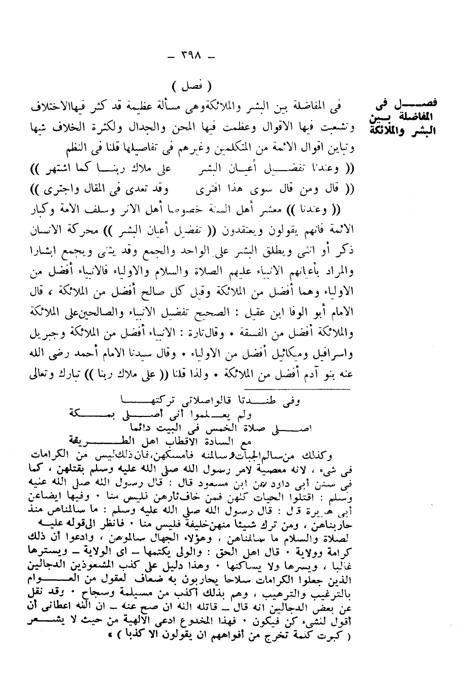 ((وَعِنْدَنَا تَفْضِيلُ أَعْيَانِ الْبَشَرْ ... عَلَى مَلَاكِ رَبِّنَا كَمَا اشْتُهِرْ))