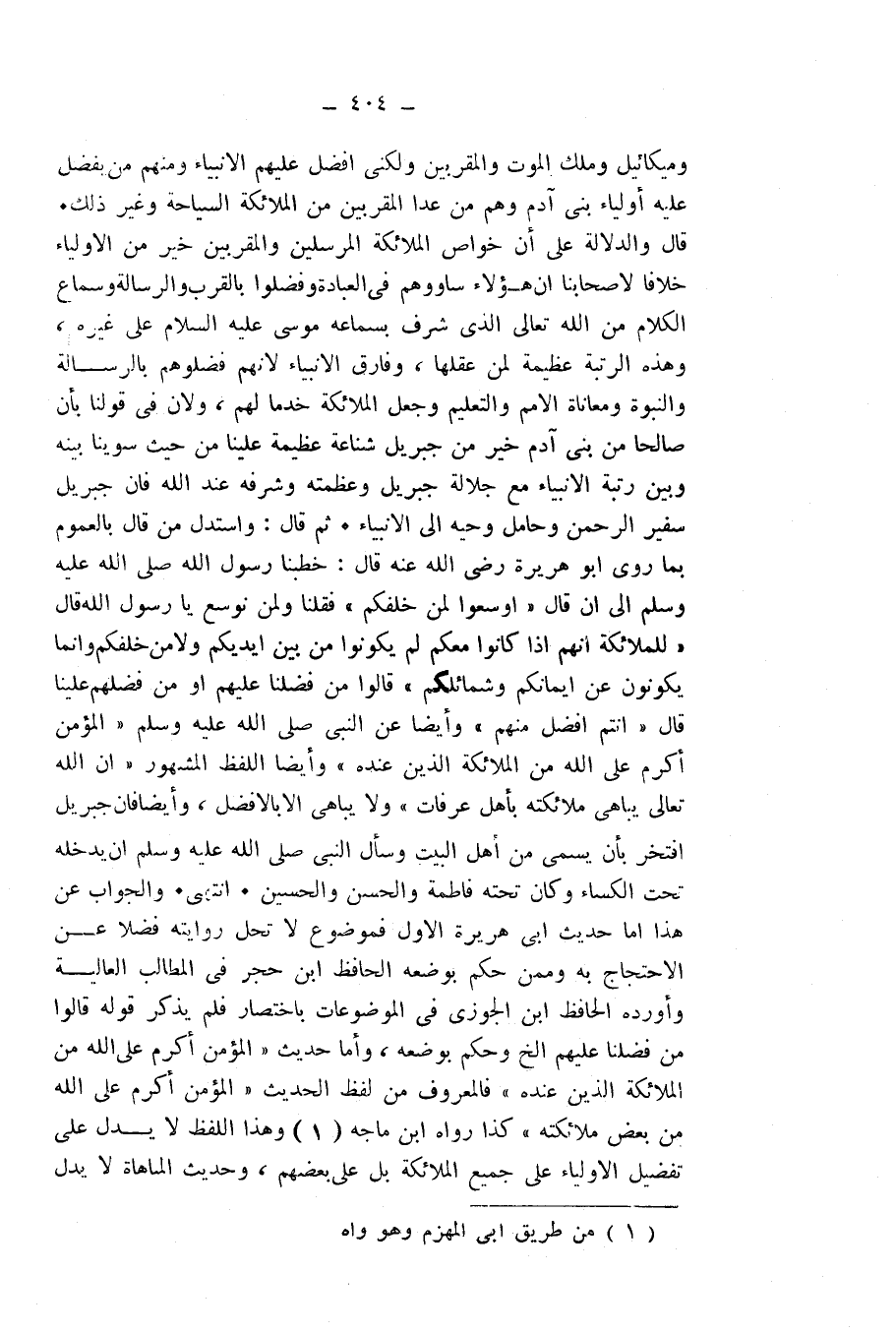 وَالْجَوَابُ عَنْ هَذَا: أَمَّا حَدِيثُ أَبِي هُرَيْرَةَ الْأَوَّلُ فَمَوْضُوعٌ لَا تَحِلُّ رِوَايَتُهُ فَضْلًا عَنْ الِاحْتِجَاجِ بِهِ، وَمِمَّنْ حَكَمَ بِوَضْعِهِ الْحَافِظُ ابْنُ حَجَرٍ فِي الْمَطَالِبِ الْعَالِيَةِ وَأَوْرَدَهُ الْحَافِظُ ابْنُ الْجَوْزِيِّ فِي الْمَوْضُوعَاتِ بِاخْتِصَارٍ، فَلَمْ يَذْكُرْ قَوْلَهُ قَالُوا: مِنْ فَضْلِنَا عَلَيْهِمْ إِلَخْ وَحَكَمَ بِوَضْعِهِ، وَأَمَّا حَدِيثُ: «الْمُؤْمِنُ أَكْرَمُ عَلَى اللَّهِ مِنَ الْمَلَائِكَةِ الَّذِينَ عِنْدَهُ» . فَالْمَعْرُوفُ مِنْ لَفْظِ الْحَدِيثِ: «الْمُؤْمِنُ أَكْرَمُ عَلَى اللَّهِ مِنْ بَعْضِ مَلَائِكَتِهِ» . كَذَا رَوَاهُ ابْنُ مَاجَهْ وَهَذَا اللَّفْظُ لَا يَدُلُّ عَلَى تَفْضِيلِ الْأَوْلِيَاءِ عَلَى جَمِيعِ الْمَلَائِكَةِ بَلْ عَلَى بَعْضِهِمْ، وَحَدِيثُ الْمُنَاهَاةِ لَا يَدُلُّ