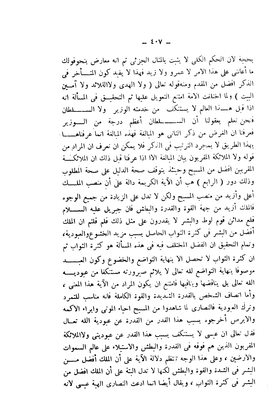 بِحُجَّةٍ لِأَنَّ الْحُكْمَ الْكُلِّيَّ لَا يَثْبُتُ بِالْمِثَالِ الْجُزْئِيِّ، ثُمَّ إِنَّهُ مُعَارَضٌ بِنَحْوِ قَوْلِكَ: مَا أَعَانَنِي عَلَى هَذَا الْأَمْرِ لَا عَمْرٌو وَلَا زَيْدٌ، فَهَذَا لَا يُفِيدُ كَوْنَ الْمُتَأَخِّرِ فِي الذِّكْرِ أَفْضَلَ مِنَ الْمُقَدَّمِ، وَمِنْهُ قَوْلُهُ تَعَالَى: {وَلَا الْهَدْيَ وَلَا الْقَلَائِدَ وَلَا آمِّينَ الْبَيْتَ} [المائدة: 2] وَلَمَّا اخْتَلَفَتِ الْأُمَّةُ امْتَنَعَ التَّعْوِيلُ عَلَيْهَا، ثُمَّ التَّحْقِيقُ فِي الْمَسْأَلَةِ أَنَّهُ قِيلَ: إِذَا قِيلَ هَذَا الْعَالِمُ لَا يَسْتَنْكِفُ مِنْ خِدْمَتِهِ الْوَزِيرُ وَلَا السُّلْطَانُ، فَنَحْنُ نَعْلَمُ بِعُقُولِنَا أَنَّ السُّلْطَانَ أَعْظَمُ دَرَجَةً مِنَ الْوَزِيرِ، فَعَرَفْنَا أَنَّ الْغَرَضَ مِنْ ذِكْرِ الثَّانِي هُوَ الْمُبَالَغَةُ، فَهَذِهِ الْمُبَالَغَةُ إِنَّمَا عَرَفْنَاهَا بِهَذَا الطَّرِيقِ لَا بِمُجَرَّدِ التَّرْتِيبِ فِي الذِّكْرِ، فَلَا يُمْكِنُ أَنْ نَعْرِفَ أَنَّ الْمُرَادَ مِنْ قَوْلِهِ: وَلَا الْمَلَائِكَةُ الْمُقَرَّبُونَ بَيَانُ الْمُبَالِغَةِ إِلَّا إِذَا عَرَفْنَا قَبْلَ ذَلِكَ أَنَّ الْمَلَائِكَةَ الْمُقَرَّبِينَ أَفْضَلُ مِنَ الْمَسِيحِ، وَحِينَئِذٍ يَتَوَقَّفُ صِحَّةُ الدَّلِيلِ عَلَى صِحَّةِ الْمَطْلُوبِ. وَذَلِكَ دَوْرٌ (الرَّابِعُ) هَبْ أَنَّ الْآيَةَ الْكَرِيمَةَ دَالَّةٌ عَلَى أَنَّ مَنْصِبَ الْمَلَكِ أَعْلَى وَأَزْيَدُ مِنْ مَنْصِبِ الْمَسِيحِ، وَلَكِنْ لَا تَدُلُّ عَلَى الزِّيَادَةِ مِنْ جَمِيعِ الْوُجُوهِ، فَالْمَلَكُ أَزْيَدُ مِنْ جِهَةِ الْقُوَّةِ وَالْقُدْرَةِ وَالْبَطْشِ، فَإِنَّ جِبْرِيلَ - عَلَيْهِ السَّلَامُ - قَلَعَ مَدَائِنَ قَوْمِ لُوطٍ، وَالْبَشَرُ لَا يَقْدِرُونَ عَلَى مَثَلِ ذَلِكَ، فَلِمَ قُلْتُمْ: إِنَّ الْمَلَكَ أَفْضَلُ مِنَ الْبَشَرِ فِي كَثْرَةِ الثَّوَابِ الْحَاصِلِ بِسَبَبِ مَزِيدِ الْخُشُوعِ وَالْعُبُودِيَّةِ؟ وَتَمَامُ التَّحْقِيقِ أَنَّ الْفَضْلَ الْمُخْتَلَفَ فِيهِ فِي هَذِهِ الْمَسْأَلَةِ هُوَ كَثْرَةُ الثَّوَابِ، ثُمَّ إِنَّ كَثْرَةَ الثَّوَابِ لَا تَحْصُلُ إِلَّا بِنِهَايَةِ التَّوَاضُعِ وَالْخُضُوعِ، وَكَوْنُ الْعَبْدِ مَوْصُوفًا بِنِهَايَةِ التَّوَاضُعِ لِلَّهِ تَعَالَى لَا يُلَائِمُ صَيْرُورَتَهُ مُسْتَنْكِفًا مِنْ عُبُودِيَّةِ اللَّهِ تَعَالَى، بَلْ يُنَاقِضُهَا وَيُنَافِيهَا فَامْتَنَعَ أَنْ يَكُونَ الْمُرَادُ مِنْ هَذِهِ الْآيَةِ هَذَا الْمَعْنَى، وَأَمَّا اتِّصَافُ الشَّخْصِ بِالْقُدْرَةِ الشَّدِيدَةِ وَالْقُوَّةِ الْكَامِلَةِ فَإِنَّهُ مُنَاسِبٌ لِلتَّمَرُّدِ وَتَرْكِ الْعُبُودِيَّةِ، فَالنَّصَارَى لَمَّا شَاهَدُوا مِنَ الْمَسِيحِ إِحْيَاءَ الْمَوْتَى وَإِبْرَاءَ الْأَكْمَهِ وَالْأَبْرَصِ أَخْرَجُوهُ بِسَبَبِ هَذَا الْقَدْرِ مِنَ الْقُدْرَةِ عَنْ عُبُودِيَّةِ اللَّهِ تَعَالَى، فَقَالَ تَعَالَى: إِنَّ عِيسَى لَا يَسْتَنْكِفُ بِسَبَبِ هَذَا الْقَدْرِ مِنَ الْقُدْرَةِ عَنْ عُبُودِيَّتِي، وَلَا الْمَلَائِكَةُ الْمُقَرَّبُونَ الَّذِينَ هُمْ فَوْقَهُ فِي الْقُدْرَةِ وَالْبَطْشِ وَالِاسْتِيلَاءِ عَلَى عَالَمِ السَّمَاوَاتِ وَالْأَرَضِينَ، وَعَلَى هَذَا الْوَجْهِ تَنْتَظِمُ دَلَالَةُ الْآيَةِ عَلَى أَنَّ الْمَلَكَ أَفْضَلُ مِنَ الْبَشَرِ فِي الشِّدَّةِ وَالْقُوَّةِ وَالْبَطْشِ، لَكِنَّهَا لَا تَدُلُّ الْبَتَّةَ عَلَى أَنَّ الْمَلَكَ أَفْضَلُ مِنَ الْبَشَرِ فِي كَثْرَةِ الثَّوَابِ، وَيُقَالُ أَيْضًا: إِنَّمَا ادَّعَتِ النَّصَارَى إِلَهِيَّةَ عِيسَى لِأَنَّهُ