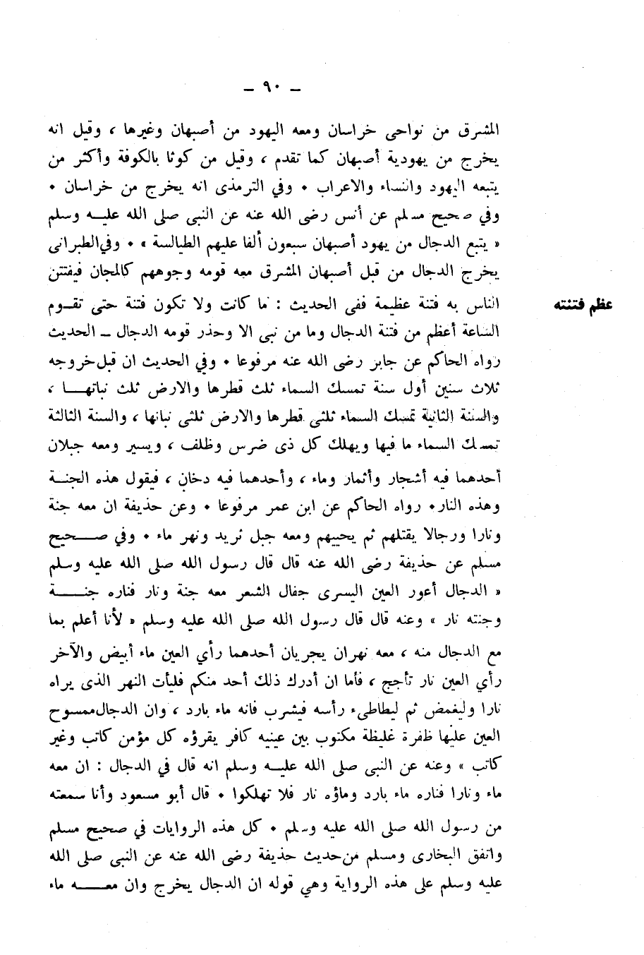 وَفِي صَحِيحِ مُسْلِمٍ عَنْ أَنَسٍ رَضِيَ اللَّهُ عَنْهُ عَنِ النَّبِيِّ صَلَّى اللَّهُ عَلَيْهِ وَسَلَّمَ " «يَتْبَعُ الدَّجَّالَ مَنْ يَهُودِ أَصْبَهَانَ سَبْعُونَ أَلْفًا عَلَيْهِمُ الطَّيَالِسَةُ» " وَفِي الطَّبَرَانِيِّ يَخْرُجُ الدَّجَّالُ مِنْ قِبَلِ أَصْبَهَانِ الْمَشْرِقِ مَعَهُ قَوْمُهُ وُجُوهُهُمْ كَالْمَجَانِّ فَيَفْتَتِنُ النَّاسُ بِهِ فِتْنَةً عَظِيمَةً. فَفِي الْحَدِيثِ: «مَا كَانَتْ وَلَا تَكُونُ فِتْنَةٌ حَتَّى تَقُومَ السَّاعَةُ أَعْظَمَ مِنْ فِتْنَةِ الدَّجَّالِ، وَمَا مِنْ نَبِيٍّ إِلَّا وَحَذَّرَ قَوْمَهُ الدَّجَّالَ» . الْحَدِيثَ، رَوَاهُ الْحَاكِمُ عَنْ جَابِرٍ رَضِيَ اللَّهُ عَنْهُ مَرْفُوعًا.