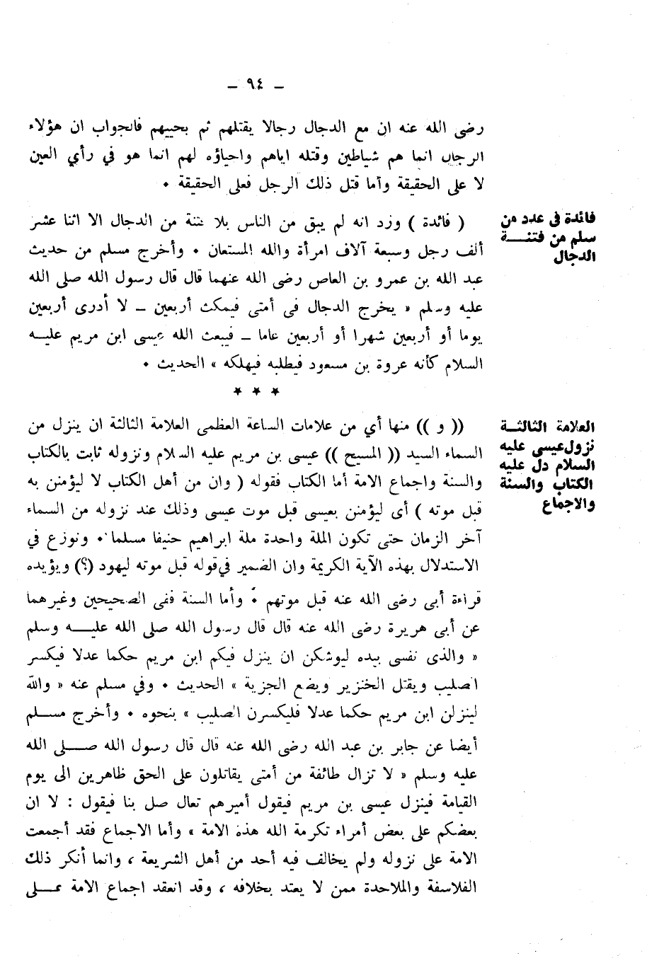وَأَخْرَجَ مُسْلِمٌ أَيْضًا عَنْ جَابِرِ بْنِ عَبْدِ اللَّهِ رَضِيَ اللَّهُ عَنْهُ قَالَ قَالَ رَسُولُ اللَّهِ صَلَّى اللَّهُ عَلَيْهِ وَسَلَّمَ " «لَا تَزَالُ طَائِفَةٌ مِنْ أُمَّتِي يُقَاتِلُونَ عَلَى الْحَقِّ ظَاهِرِينَ إِلَى يَوْمِ الْقِيَامَةِ فَيَنْزِلُ عِيسَى ابْنُ مَرْيَمَ فَيَقُولُ أَمِيرُهُمْ: تَعَالَ صَلِّ بِنَا فَيَقُولُ: لَا إِنَّ بَعْضَكُمْ عَلَى بَعْضٍ أُمَرَاءُ تَكْرِمَةَ اللَّهِ هَذِهِ الْأُمَّةَ» ".