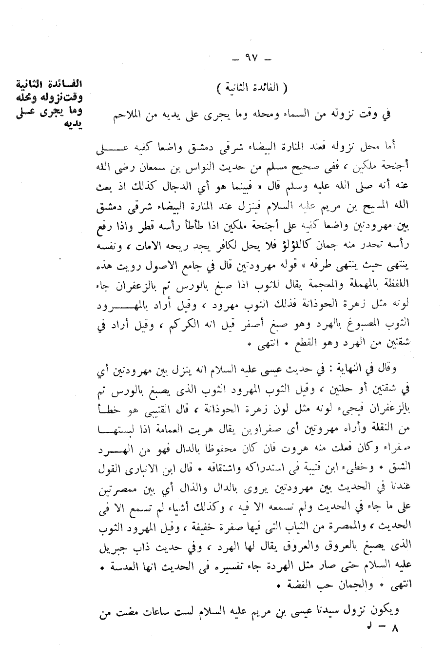 فِي وَقْتِ نُزُولِهِ مِنَ السَّمَاءِ وَمَحَلُّهُ وَمَا يَجْرِي عَلَى يَدَيْهِ مِنَ الْمَلَاحِمِ.