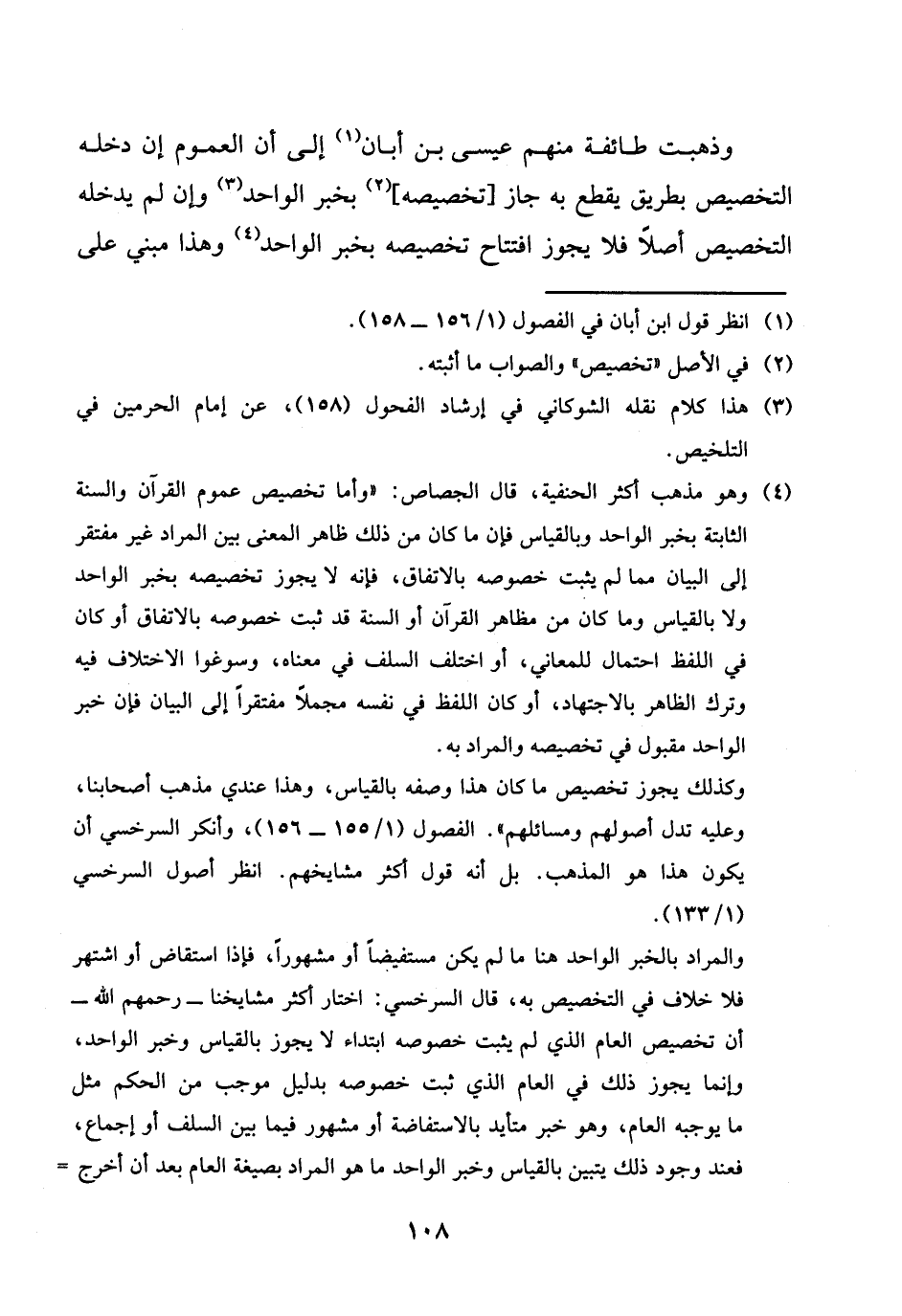 وَذَهَبت طَائِفَة مِنْهُم عِيسَى بن أبان إِلَى أَن الْعُمُوم إِن دخله التَّخْصِيص بطرِيق يقطع بِهِ جَازَ [تَخْصِيصه] بِخَبَر الْوَاحِد وَإِن لم يدْخلهُ التَّخْصِيص أصلا فَلَا يجوز افْتِتَاح تَخْصِيصه بِخَبَر الْوَاحِد وَهَذَا مَبْنِيّ على