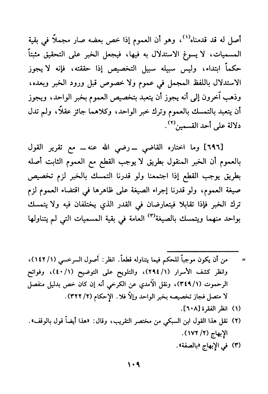 [696] وَمَا اخْتَارَهُ القَاضِي - رَضِي الله عَنهُ - مَعَ تَقْرِير القَوْل بِالْعُمُومِ أَن الْخَبَر الْمَنْقُول بطرِيق لَا يُوجب الْقطع مَعَ الْعُمُوم الثَّابِت أَصله بطرِيق يُوجب الْقطع إِذا اجْتَمَعنَا ولوقدرنا التَّمَسُّك بالْخبر لزم تَخْصِيص صِيغَة الْعُمُوم، وَلَو قَدرنَا إِجْرَاء الصِّيغَة على ظَاهرهَا فِي اقْتِضَاء الْعُمُوم لزم ترك الْخَبَر فَإِذا تقابلا فيتعارضان فِي الْقدر الَّذِي يَخْتَلِفَانِ فِيهِ وَلَا يتَمَسَّك بِوَاحِد مِنْهُمَا ويتمسك بالصيغة الْعَامَّة فِي بَقِيَّة المسميات الَّتِي لم يَتَنَاوَلهَا