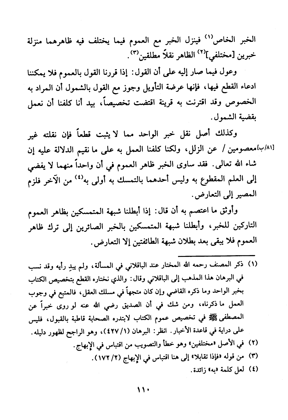 وَكَذَلِكَ أصل نقل خبر الْوَاحِد مِمَّا لَا يثبت قطعا فَإِن نقلته غير [81 / ب] معصومين / عَن الزلل، وَلَكنَّا كلفنا الْعَمَل بِهِ على مَا نُقِيم الدّلَالَة عَلَيْهِ إِن شَاءَ الله تَعَالَى. فقد سَاوَى الْخَبَر ظَاهر الْعُمُوم فِي أَن وَاحِدًا مِنْهُمَا لَا يُفْضِي إِلَى الْعلم الْمَقْطُوع بِهِ وَلَيْسَ أَحدهمَا بالتمسك بِهِ أولى بِهِ من الآخر فَلَزِمَ الْمصير إِلَى التَّعَارُض.