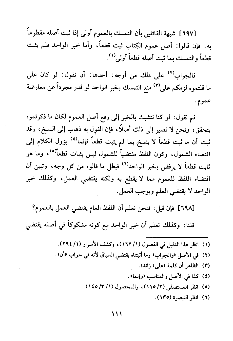 [697] شُبْهَة الْقَائِلين بِأَن التَّمَسُّك بِالْعُمُومِ أولى إِذا ثَبت اصله مَقْطُوعًا بِهِ: فَإِن قَالُوا: أصل عُمُوم الْكتاب ثَبت قطعا، وَأما خبر الْوَاحِد فَلم يثبت قطعا والتمسك بِمَا ثَبت أَصله قطعا أولى.