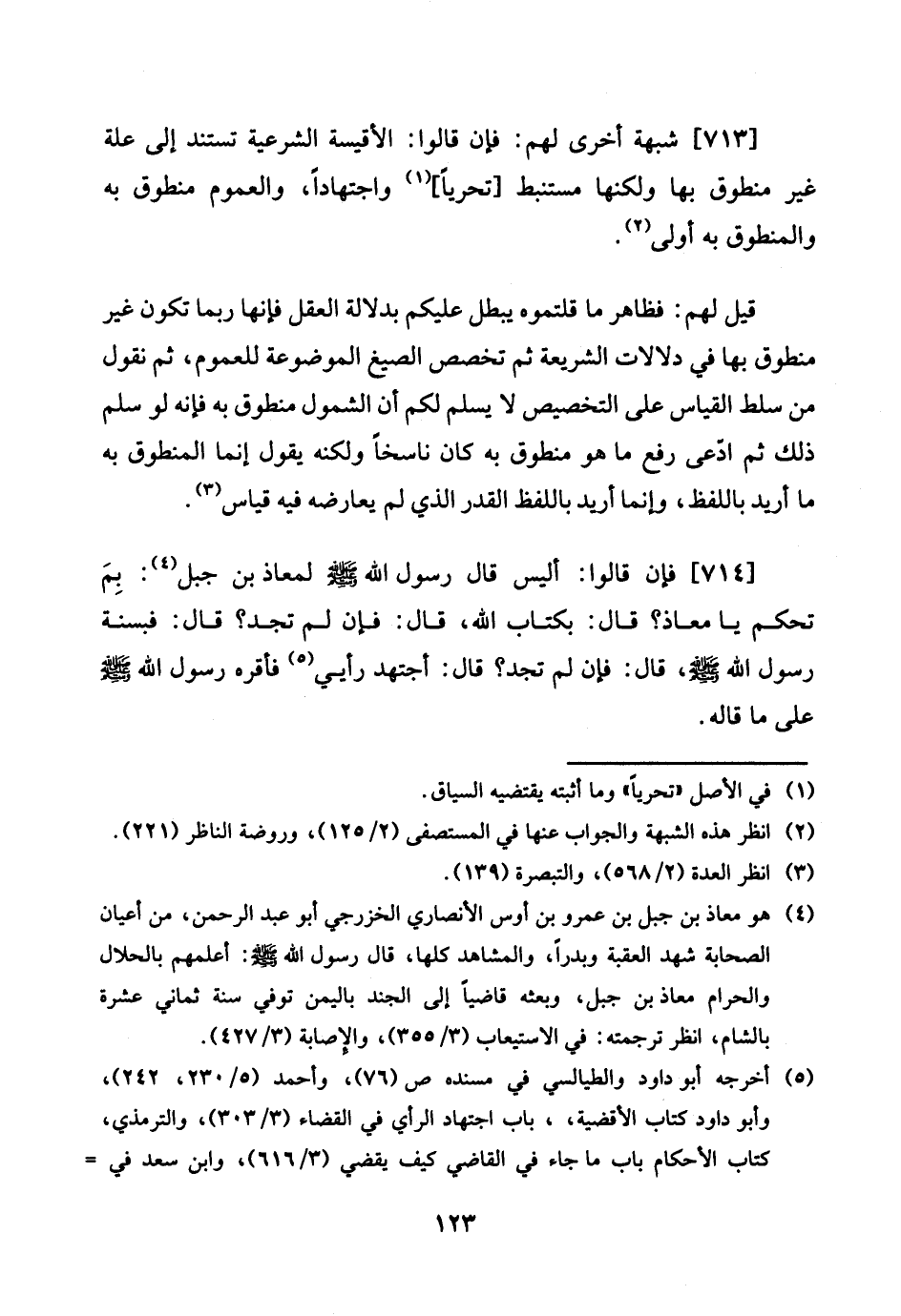 [714] فَإِن قَالُوا: أَلَيْسَ قَالَ رَسُول الله صلى الله عَلَيْهِ وَسلم لِمعَاذ بن جبل: بِمَ تحكم يَا معَاذ؟ قَالَ: بِكِتَاب الله، قَالَ: فَإِن لم تَجِد؟ قَالَ: فبسنة رَسُول الله صلى الله عَلَيْهِ وَسلم، قَالَ: فان لم تَجِد؟ قَالَ: اجْتهد رَأْيِي فأقره رَسُول الله صلى الله عَلَيْهِ وَسلم على مَا قَالَه.