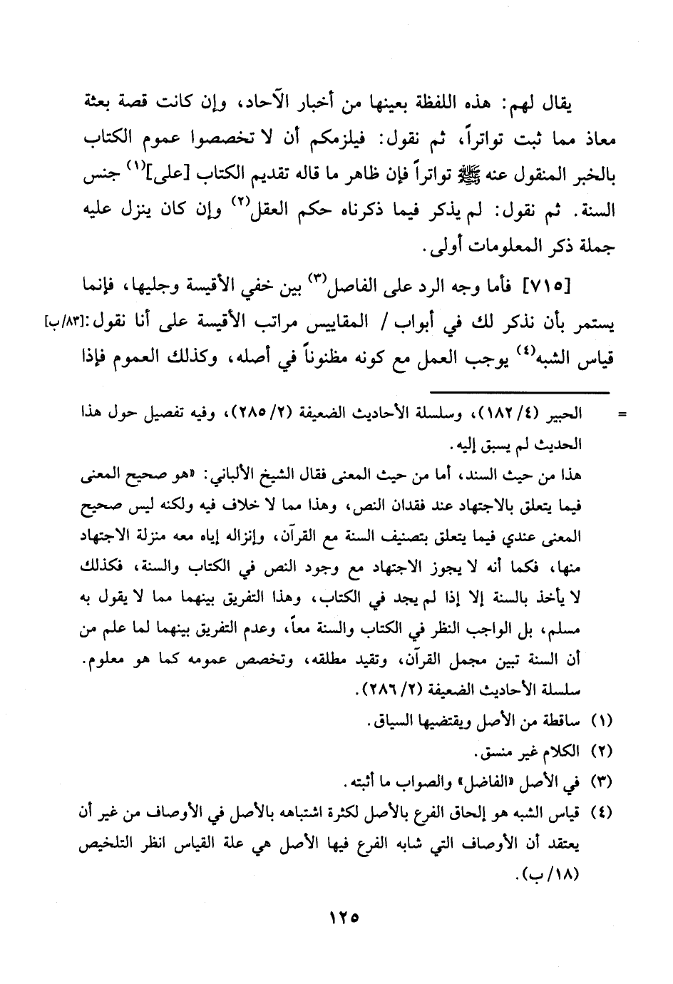 [715] فَأَما وَجه الرَّد على الْفَاصِل بَين خَفِي الأقيسة وجليها، فَإِنَّمَا يسْتَمر بَان نذْكر لَك فِي أَبْوَاب / المقاييس مَرَاتِب الأقيسة على أَنا نقُول: [83 / ب] قِيَاس الشّبَه يُوجب الْعَمَل مَعَ كَونه مظنونا فِي أَصله، وَكَذَلِكَ الْعُمُوم فَإِذا