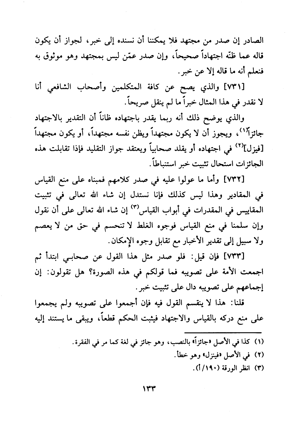 [31] وَالَّذِي يَصح عَن كَافَّة الْمُتَكَلِّمين وَأَصْحَاب الشَّافِعِي أَنا لَا نقدر فِي هَذَا الْمِثَال خَبرا مَا لم ينْقل صَرِيحًا.