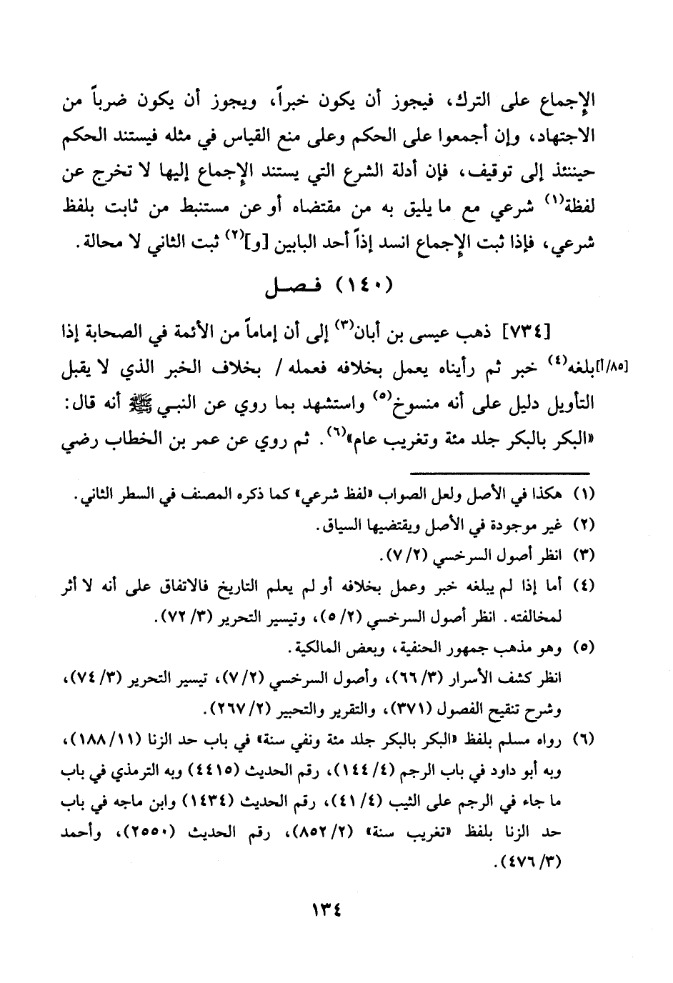 (140) فصل [734] ذهب عِيسَى بن أبان إِلَى أَن إِمَامًا من الْأَئِمَّة فِي الصَّحَابَة إِذا [85 / أ] بلغه خبر ثمَّ رَأَيْنَاهُ يعْمل بِخِلَافِهِ فعمله / بِخِلَاف الْخَبَر الَّذِي لَا يقبل التَّأْوِيل دَلِيل على أَنه مَنْسُوخ وَاسْتشْهدَ بِمَا رُوِيَ عَن النَّبِي صلى الله عَلَيْهِ وَسلم أَنه قَالَ " الْبكر بالبكر جلد مئة وتغريب عَام ". ثمَّ رُوِيَ عَن عمر بن الْخطاب رَضِي