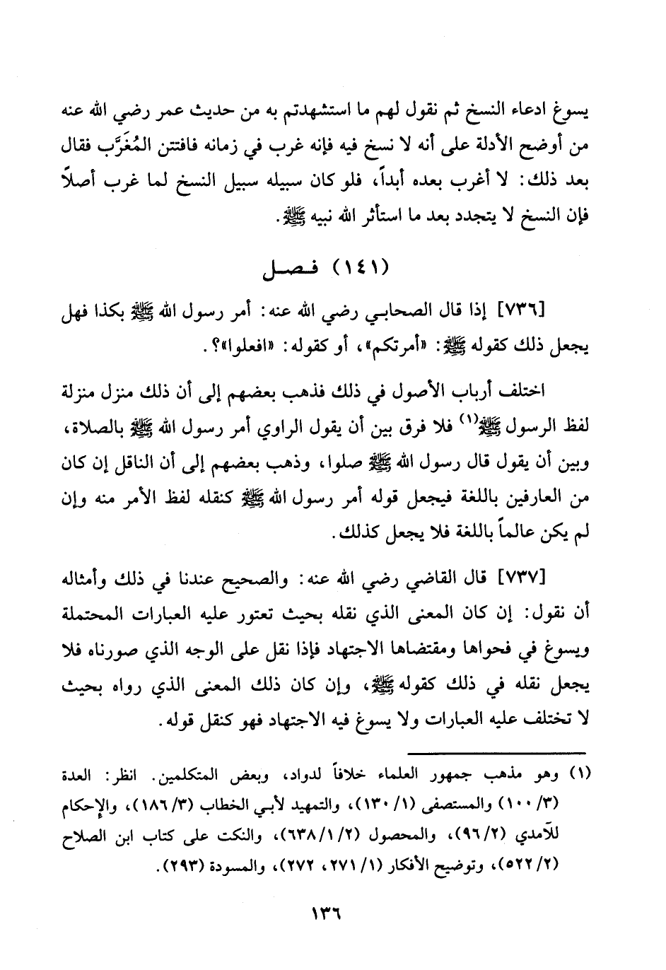 [737] قَالَ القَاضِي رَضِي الله عَنهُ: وَالصَّحِيح عندنَا] فِي ذَلِك وَأَمْثَاله أَن نقُول: إِن كَانَ الْمَعْنى الَّذِي نَقله بِحَيْثُ تعتور عَلَيْهِ الْعبارَات المحتملة ويسوغ فِي فحواها ومقتضاها الِاجْتِهَاد فَإِذا نقل على الْوَجْه الَّذِي صورناه فَلَا يَجْعَل نَقله فِي ذَلِك كَقَوْلِه صلى الله عَلَيْهِ وَسلم، وَإِن كَانَ ذَلِك الْمَعْنى الَّذِي رَوَاهُ بِحَيْثُ لَا تخْتَلف عَلَيْهِ الْعبارَات وَلَا يسوغ فِيهِ الِاجْتِهَاد فَهُوَ كنقل قَوْله.