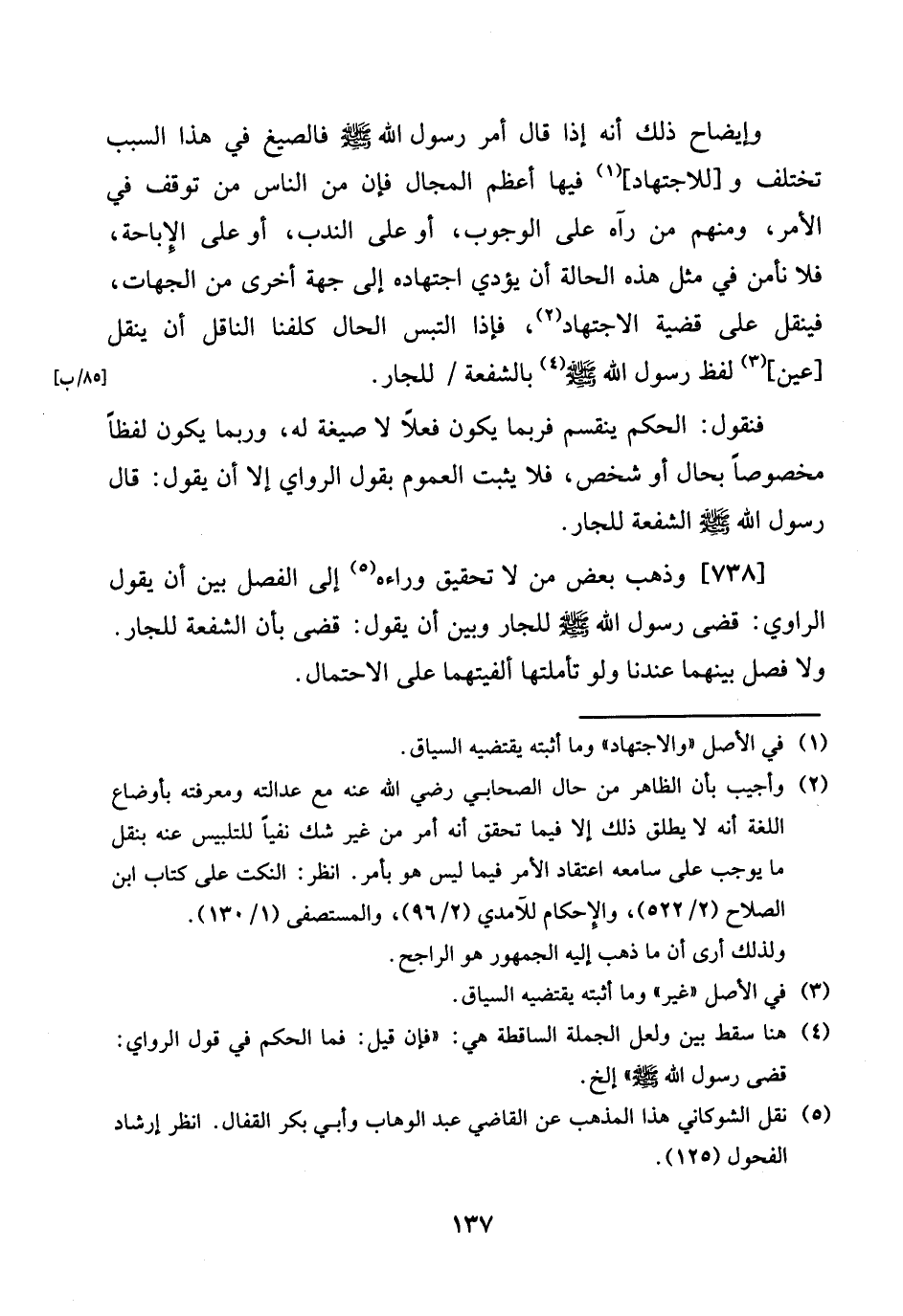 وإيضاح ذَلِك أَنه إِذا قَالَ أَمر رَسُول الله صلى الله عَلَيْهِ وَسلم فالصيغ فِي هَذَا السَّبَب تخْتَلف و [للِاجْتِهَاد] فِيهَا أعظم المجال فَإِن من النَّاس من توقف فِي الْأَمر، وَمِنْهُم من رَآهُ على الْوُجُوب أَو على النّدب، اَوْ على الْإِبَاحَة، فَلَا نَأْمَن فِي مثل هَذِه الْحَالة أَن يُؤَدِّي اجْتِهَاده إِلَى جِهَة أُخْرَى من الْجِهَات، فينقل على قَضِيَّة الِاجْتِهَاد، فَإِذا الْتبس الْحَال كلفنا النَّاقِل أَن ينْقل [عين] لفظ رَسُول الله صلى الله عَلَيْهِ وَسلم. بِالشُّفْعَة / للْجَار