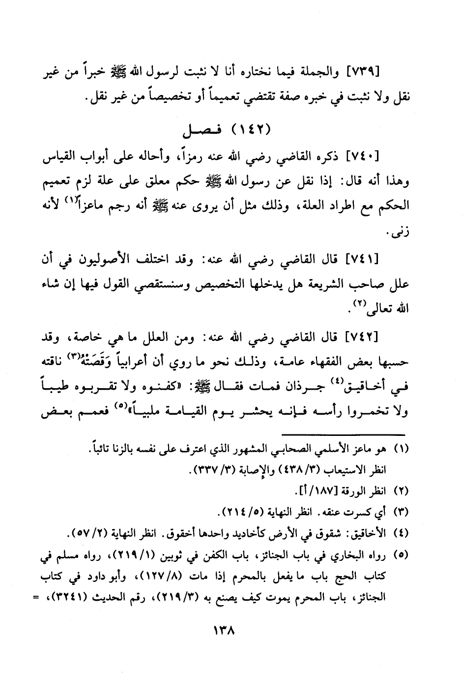 [741] قَالَ القَاضِي رَضِي الله عَنهُ: وَقد اخْتلف الأصوليون فِي أَن علل صَاحب الشَّرِيعَة هَل يدخلهَا التَّخْصِيص وسنستقصي القَوْل فِيهَا إِن شَاءَ الله تَعَالَى. 3 [742] قَالَ القَاضِي رَضِي الله عَنهُ: وَمن الْعِلَل مَا هِيَ خَاصَّة، وَقد حسبتها بعض الْفُقَهَاء عَامَّة، وَذَلِكَ نَحْو مَا رُوِيَ أَن أَعْرَابِيًا وقصته نَاقَته فِي أخاقيق جرذان فَمَاتَ فَقَالَ صلى الله عَلَيْهِ وَسلم: " كفنوه وَلَا تقربوه طيبا وَلَا تخمروا رَأسه فَإِنَّهُ يحْشر يَوْم الْقِيَامَة ملبيا " فعمم بعض