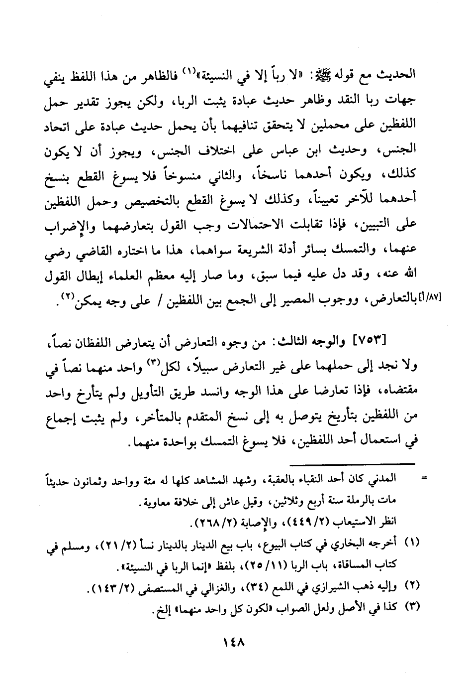 الحَدِيث مَعَ قَوْله صلى الله عَلَيْهِ وَسلم: " لَا رَبًّا إِلَّا فِي النَّسِيئَة " فَالظَّاهِر من هَذَا اللَّفْظ يَنْفِي جِهَات رَبًّا النَّقْد وَظَاهر حَدِيث عبَادَة يثبت الرِّبَا، وَلَكِن يجوز تَقْدِير حمل اللَّفْظَيْنِ على محملين لَا يتَحَقَّق تنافيهما بِأَن يحمل حَدِيث عبَادَة على اتِّحَاد الْجِنْس، وَحَدِيث ابْن عَبَّاس على اخْتِلَاف الْجِنْس، وَيجوز أَن لَا يكون كَذَلِك، وَيكون أَحدهمَا نَاسِخا، وَالثَّانِي مَنْسُوخا فَلَا يسوغ الْقطع بنسخ أَحدهمَا للْآخر تعيينا، وَكَذَلِكَ لَا يسوغ الْقطع بالتخصيص وَحمل اللفظفين على التَّبْيِين، فَإِذا تقابلت الِاحْتِمَالَات وَجب القَوْل بتعارضهما والإضراب عَنْهُمَا، والتمسك بِسَائِر أَدِلَّة الشَّرِيعَة سواهُمَا، هَذَا مَا اخْتَارَهُ القَاضِي رَضِي الله عَنهُ، وَقد دلّ عَلَيْهِ فِيمَا سبق، وَمَا صَار إيه مُعظم الْعلمَاء إبِْطَال القَوْل [87 / أ] بالتعارض، وَوُجُوب الْمصير إِلَى الْجمع بَين اللَّفْظَيْنِ / على وَجه يُمكن.