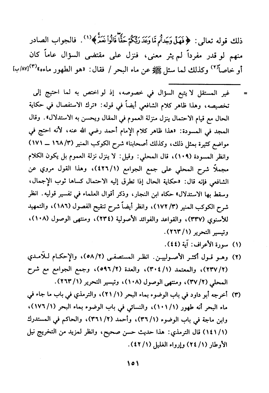 ذَلِك قَوْله تَعَالَى: {فَهَل وجدْتُم مَا وعد ربكُم حَقًا قَالُوا نعم} . فَالْجَوَاب الصَّادِر مِنْهُم لَو قدر مُفردا لم يثر معنى، فَنزل على مُقْتَضى السُّؤَال عَاما كَانَ أَو خَاصّا وَكَذَلِكَ لما سُئِلَ صلى الله عَلَيْهِ وَسلم عَن مَاء الْبَحْر / فَقَالَ: " هُوَ الطّهُور مَاءَهُ " [87 / ب]