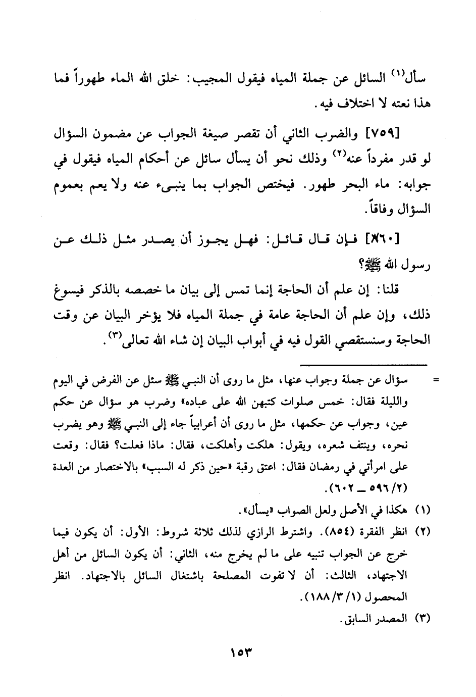 [759 ي وَالضَّرْب الثَّانِي أَن تقصر صِيغَة الْجَواب عَن مَضْمُون السُّؤَال لَو قدر مُفردا عَنهُ وَذَلِكَ نَحْو أَن يسْأَل سَائل عَن أَحْكَام الْمِيَاه فَيَقُول فِي جَوَابه: مَاء الْبَحْر طهُور. فَيخْتَص الْجَواب بِمَا ينبىء عَنهُ وَلَا يعم بِعُمُوم السُّؤَال وفَاقا.