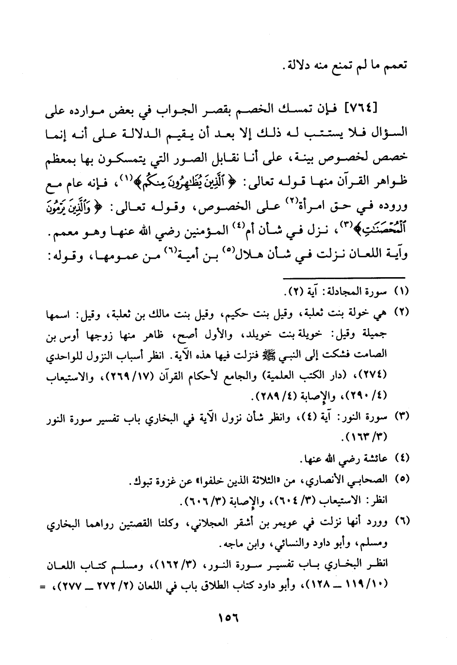 [764] فَإِن تمسك الْخصم بقصر الْجَواب فِي بعض موارده على السُّؤَال فَلَا يستتب لَهُ ذَلِك إِلَّا بعد أَن يُقيم الدّلَالَة على أَنه إِنَّمَا خصص لخُصُوص بَيِّنَة، على أَنا نقابل الصُّور الَّتِي يتمسكون بهَا بمعظم ظواهر الْقُرْآن مِنْهَا قَوْله تَعَالَى: {الَّذين يظهرون مِنْكُم} ، فَإِنَّهُ عَام مَعَ وُرُوده فِي حق امْرَأَة على الْخُصُوص، وَقَوله تَعَالَى: {وَالَّذين يرْمونَ الْمُحْصنَات} ، نزل فِي شَأْن أم الْمُؤمنِينَ رَضِي الله عَنْهَا وَهُوَ معمم. وَآيَة اللّعان نزلت فِي شَأْن هِلَال بن أُميَّة من عمومها، وَقَوله: