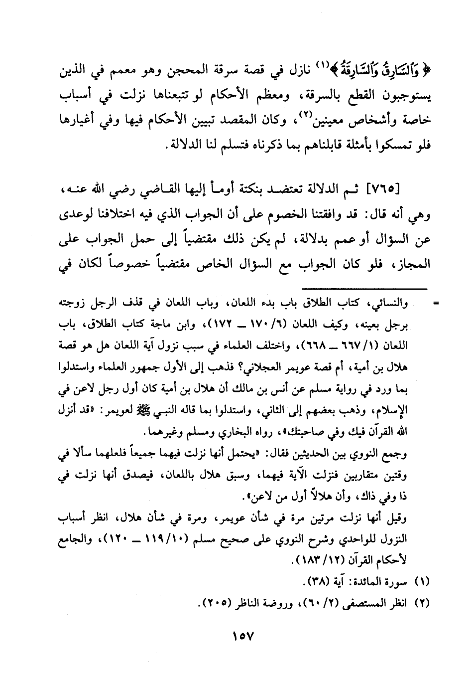 {وَالسَّارِق والسارقة} نَازل فِي قصَّة سَرقَة المحجن وَهُوَ معمم فِي الَّذين يستوجبون الْقطع بِالسَّرقَةِ، ومعظم الْأَحْكَام لَو تتبعناها نزلت فِي أَسبَاب خَاصَّة واشخاص مُعينين، وَكَانَ الْمَقْصد تَبْيِين الْأَحْكَام فِيهَا وَفِي أغيارها فَلَو تمسكوا بأمثلة قابلناهم بِمَا ذَكرْنَاهُ فتسلم لنا الدّلَالَة.