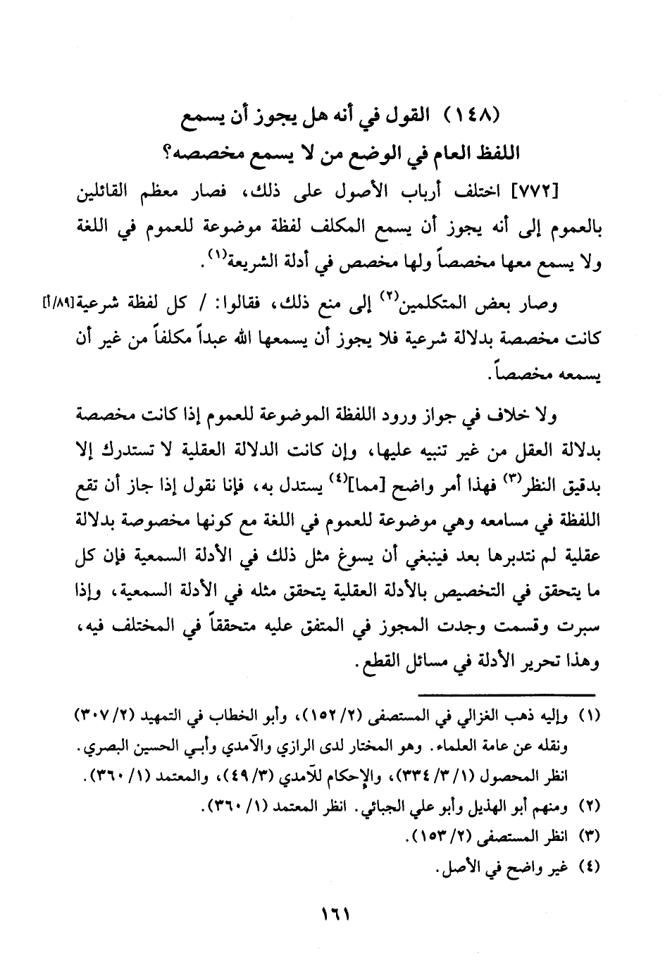 [772] اخْتلف ارباب الْأُصُول على ذَلِك، فَصَارَ مُعظم الْقَائِلين بِالْعُمُومِ إِلَى أَنه يجوز أَن يسمع الْمُكَلف لَفظه مَوْضُوعَة للْعُمُوم فِي اللُّغَة وَلَا يسمع مَعهَا مُخَصّصا وَلها مُخَصص فِي أَدِلَّة الشَّرِيعَة.