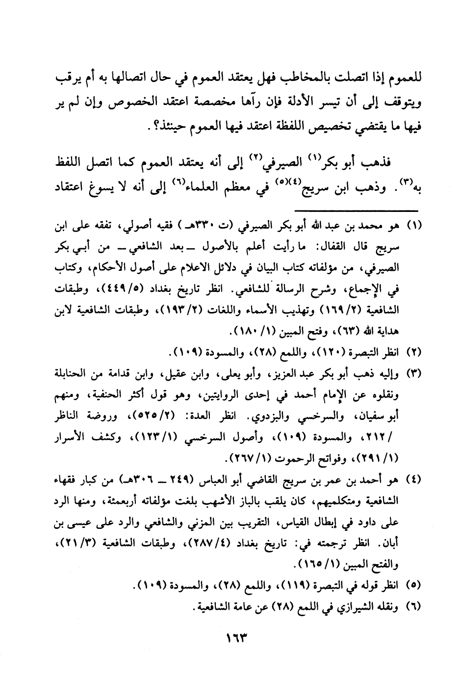 فَذهب أَبُو بكر الصَّيْرَفِي إِلَى أَنه يعْتَقد الْعُمُوم كَمَا اتَّصل اللَّفْظ بِهِ. وَذهب ابْن سُرَيج فِي مُعظم الْعلمَاء إِلَى أَنه لَا يسوغ اعْتِقَاد