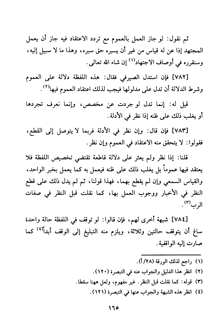 [783] فَإِن قَالَ: وَإِن نظر فِي الْأَدِلَّة فَرُبمَا لَا يتَوَصَّل إِلَى الْقطع، فَقولُوا: لَا يتَحَقَّق مِنْهُ الِاعْتِقَاد فِي الْعُمُوم وَإِن نظر.