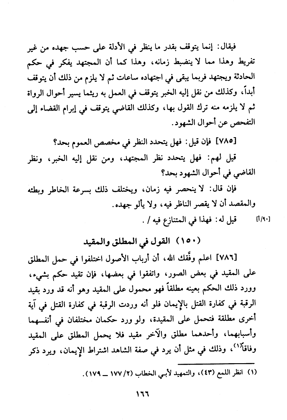 [786] اعْلَم وفقك الله، أَن أَرْبَاب الْأُصُول اخْتلفُوا فِي حمل الْمُطلق على الْمُقَيد فِي بعض الصُّور، وَاتَّفَقُوا فِي بَعْضهَا، فَإِن تقيد حكم بِشَيْء، وَورد ذَلِك الحكم بِعَيْنِه مُطلقًا فَهُوَ مَحْمُول على الْمُقَيد وَهُوَ أَنه قد ورد بِقَيْد الرَّقَبَة فِي كَفَّارَة الْقَتْل بِالْإِيمَان فَلَو أَنه وَردت الرَّقَبَة فِي كَفَّارَة الْقَتْل فِي آيَة أُخْرَى مُطلقَة فَتحمل على الْمقيدَة، وَلَو ورد حكمان مُخْتَلِفَانِ فِي أَنفسهمَا واسبابهما، وَأَحَدهمَا مُطلق والاخر مُقَيّد فَلَا يحمل الْمُطلق على الْمُقَيد وفَاقا، وَذَلِكَ فِي مثل ان يرد فِي صفة الشَّاهِد اشْتِرَاط الْإِيمَان، وَيرد ذكر