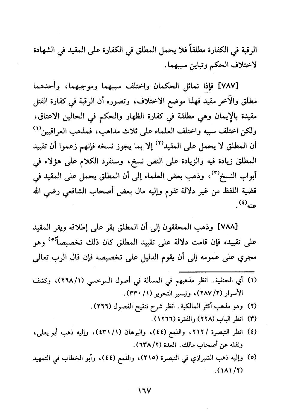 [788] وَذهب الْمُحَقِّقُونَ إِلَى أَن الْمُطلق يقر على إِطْلَاقه ويقر الْمُقَيد على تَقْيِيده فَإِن قَامَت دلَالَة على تَقْيِيد الْمُطلق كَانَ ذَلِك تَخْصِيصًا وَهُوَ مجري على عُمُومه إِلَى أَن يقوم الدَّلِيل على تَخْصِيصه فَإِن قَالَ الرب تَعَالَى