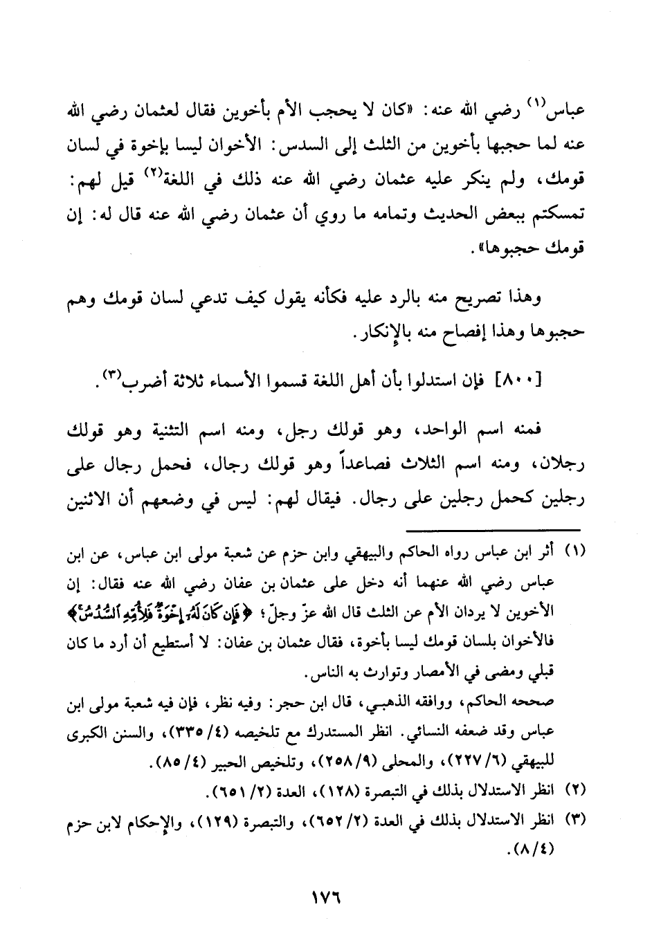 عَبَّاس رَضِي الله عَنهُ: " كَانَ لَا يحجب الْأُم بأخوين فَقَالَ لعُثْمَان رَضِي الله عَنهُ لما حجبها بأخوين من الثُّلُث إِلَى السُّدس: الأخوان ليسَا بإخوة فِي لِسَان قَوْمك، وَلم يُنكر عَلَيْهِ عُثْمَان رَضِي الله عَنهُ ذَلِك فِي اللُّغَة قيل لَهُم: تمسكتم ببعضهم الحَدِيث وَتَمَامه مَا رُوِيَ أَن عُثْمَان رَضِي الله عَنهُ قَالَ لَهُ: إِن قَوْمك حجبوها "
