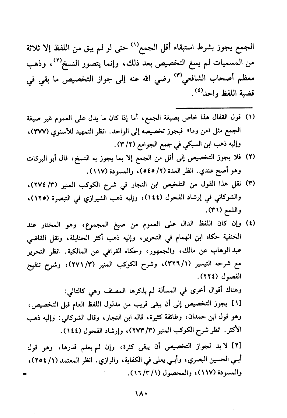 الْجمع يجوز بِشَرْط اسْتِبْقَاء اقل الْجمع حَتَّى لَو لم يبْق من اللَّفْظ إِلَّا ثَلَاثَة من المسميات لم يسغْ التَّخْصِيص بعد ذَلِك، وَإِنَّمَا يتَصَوَّر النّسخ، وَذهب مُعظم أَصْحَاب الشَّافِعِي رَضِي الله عَنهُ إِلَى جَوَاز التَّخْصِيص مَا بَقِي فِي قَضِيَّة اللَّفْظ