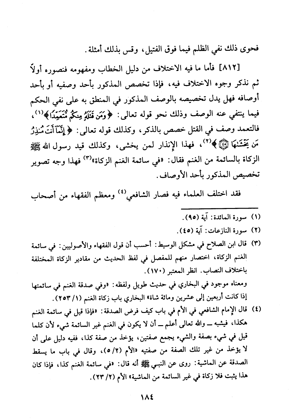 [812] فَأَما مَا فِيهِ الِاخْتِلَاف من دَلِيل الْخطاب وَمَفْهُومه فنصوره أَولا ثمَّ نذْكر وُجُوه الِاخْتِلَاف فِيهِ، فَإِذا تخصص الْمَذْكُور بِأحد وَصفيه أَو باحد أَوْصَافه فَهَل يدل تَخْصِيصه بِالْوَصْفِ الْمَذْكُور فِي الْمنطق بِهِ على نفي الحكم فِيمَا يَنْتَفِي عَنهُ الْوَصْف وَذَلِكَ نَحْو قَوْله تَعَالَى: {وَمن قَتله مِنْكُم مُتَعَمدا} ، فالتعمد وصف فِي الْقَتْل خصص بِالذكر، وَكَذَلِكَ قَوْله تَعَالَى: {إِنَّمَا أَنْت مُنْذر من يخشها 45} فَهَذَا الْإِنْذَار لمن يخْشَى، وَكَذَلِكَ قيد رَسُول الله صلى الله عَلَيْهِ وَسلم الزَّكَاة بالسائمة من الْغنم فَقَالَ: " فِي سَائِمَة الْغنم الزَّكَاة " فَهَذَا وَجه تَصْوِير تَخْصِيص الْمَذْكُور بِأحد الْأَوْصَاف.