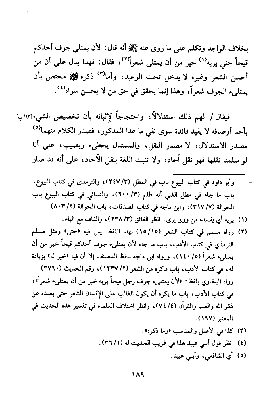 بِخِلَاف الْوَاجِد وَتكلم على مَا روى عَنهُ صلى الله عَلَيْهِ وَسلم أَنه قَالَ: لِأَن يمتلى جَوف أحدكُم قَيْحا حَتَّى يرِيه خير من أَن يمتلى شعرًا،، فَقَالَ: فَهَذَا يدل على أَن من أحسن الشّعْر وَغَيره لَا يدْخل تَحت الْوَعيد، وَأما ذكره صلى الله عَلَيْهِ وَسلم مُخْتَصّ بِأَن يمتلىء الْجوف شعرًا، وَهَذَا إِنَّمَا يُحَقّق فِي حق من لَا يحسن سواهُ.