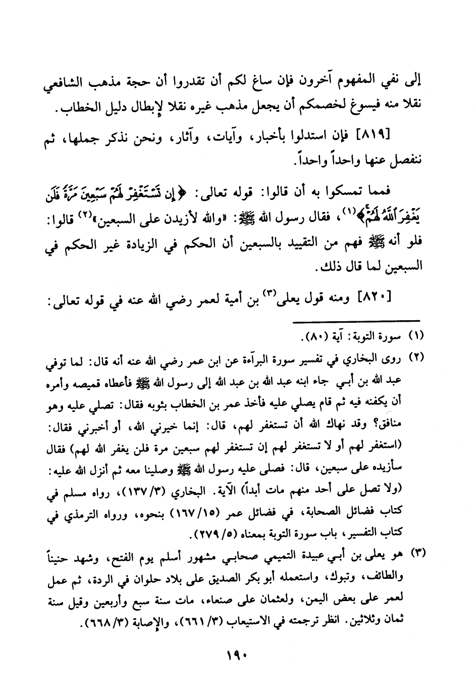فمما تمسكوا بِهِ أَن قَالُوا: قَوْله تَعَالَى: {إِن تستغفر لَهُم سبعين مرّة فَلَنْ يغْفر الله لَهُم} ، فَقَالَ رَسُول الله صلى الله عَلَيْهِ وَسلم: " وَالله لأزيدن على السّبْعين " قَالُوا: فَلَو أَنه صلى الله عَلَيْهِ وَسلم فهم من التَّقْيِيد بالسبعين أَن الحكم فِي الزِّيَادَة غير الحكم فِي السعبين لما قَالَ ذَلِك.