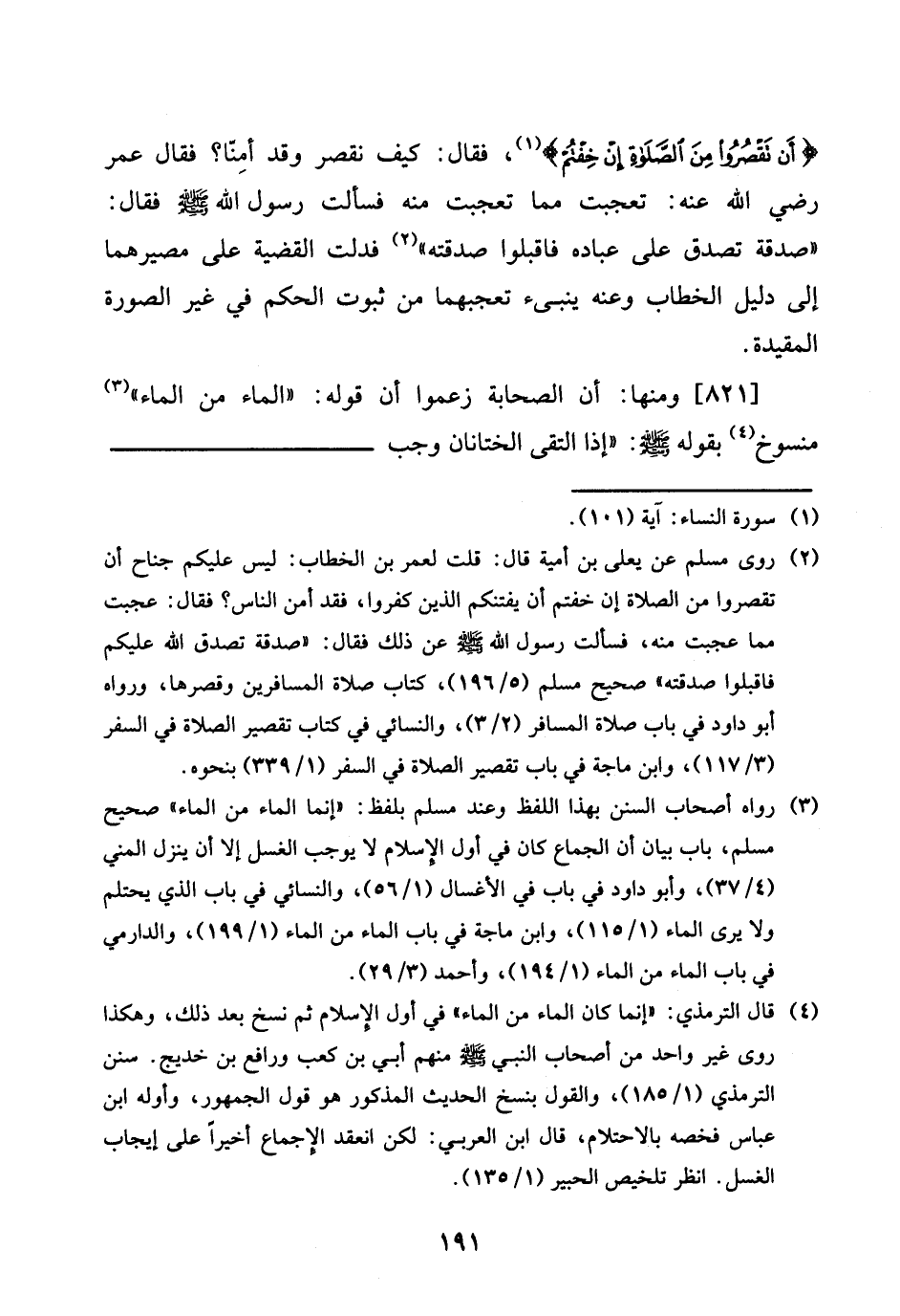 [821] مِنْهَا: أَن الصَّحَابَة زَعَمُوا أَن قَوْله: " المَاء من المَاء " مَنْسُوخ بقوله صلى الله عَلَيْهِ وَسلم: " إِذا التقى الختانان وَجب