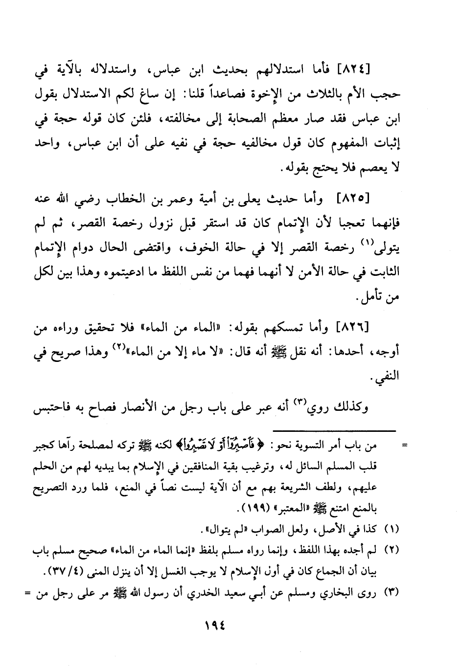 [825] وَأما حَدِيث يعلى بن أُميَّة وَعمر بن الْخطاب رَضِي الله عَنهُ فَإِنَّهُمَا تَعَجبا لِأَن الْإِتْمَام كَانَ قد اسْتَقر قبل نزُول رخصَة الْقصر، ثمَّ لم يتَوَلَّى رخصَة الْقصر إِلَّا فِي حَالَة الْخَوْف، وَاقْتضى الْحَال دوَام الْإِتْمَام الثَّابِت فِي حَالَة الْأَمْن لَا أَنَّهُمَا فهما من نفس اللَّفْظ مَا ادعيتموه وَهَذَا بَين لكل من تَأمل.