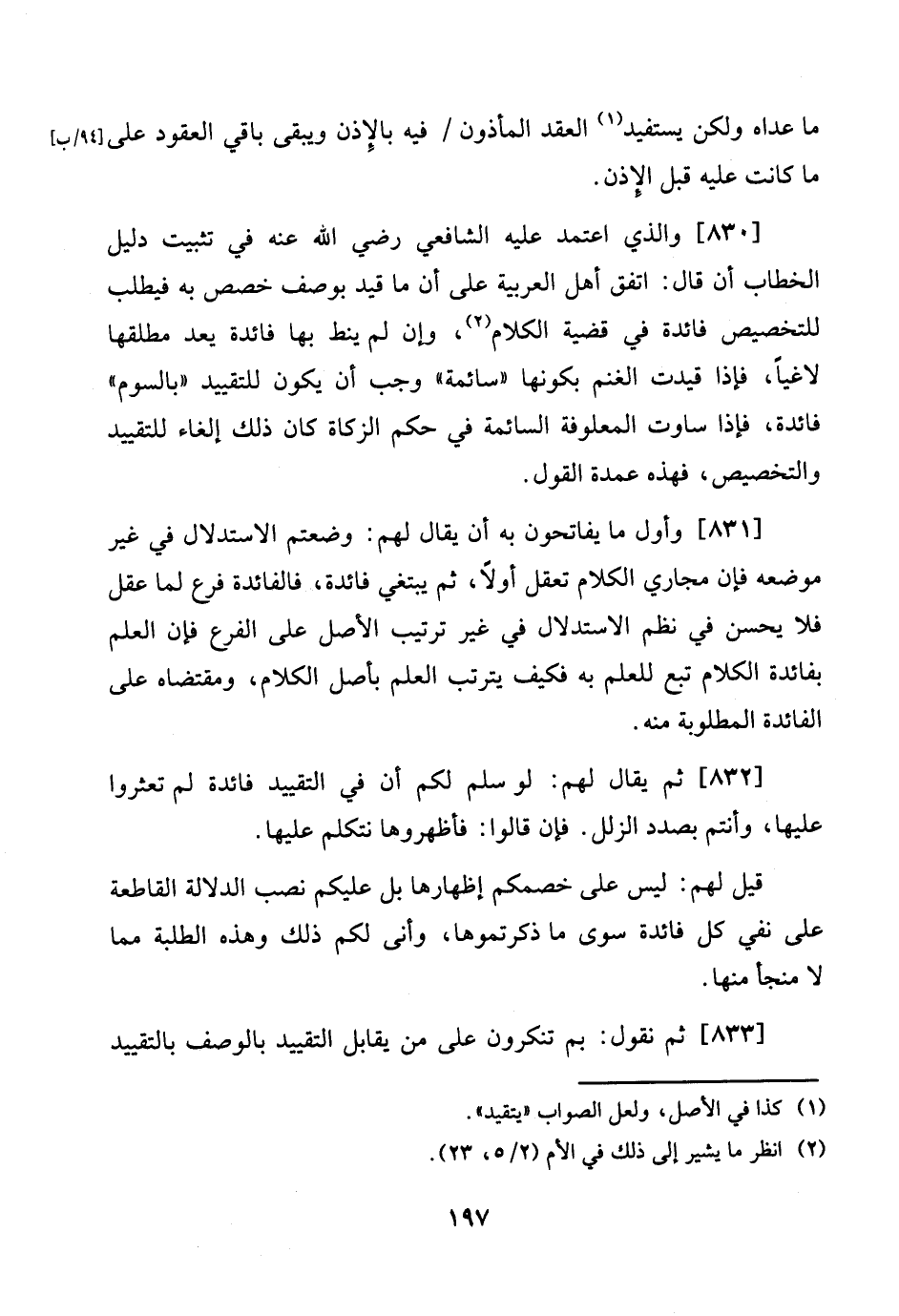 [833] ثمَّ نقُول: بِمَ تنكرون على من يُقَابل التَّقْيِيد بِالْوَصْفِ بالتقييد