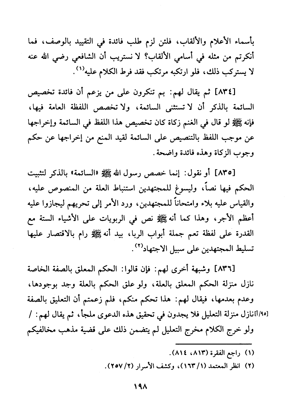 [836] وشبهة أُخْرَى لَهُم: فان قَالُوا: الحكم الْمُعَلق بِالصّفةِ الْخَاصَّة نَازل منزلَة الحكم الْمُعَلق بالعله، وَلَو علق الحكم بِالْعِلَّةِ وجد بوجودها، وَعدم بعدمها، فَيُقَال لَهُم: هَذَا تحكم مِنْكُم، فَلم زعمتم أَن التَّعْلِيق بِالصّفةِ [95 / أ] نَازل منزلَة التَّعْلِيل فَلَا يَجدونَ فِي تَحْقِيق هَذِه الدَّعْوَى ملْجأ، ثمَّ يُقَال لَهُم: / وَلَو خرج الْكَلَام مخرج التَّعْلِيل لم يتَضَمَّن ذَلِك على قَضِيَّة مَذْهَب مخالفيكم