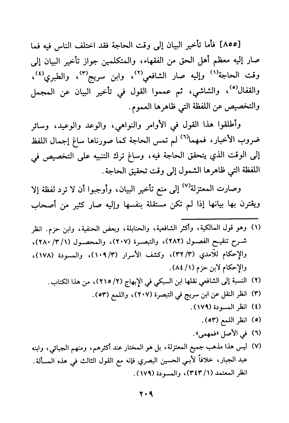 [855] فَأَما تَأْخِير الْبَيَان إِلَى وَقت الْحَاجة فقد اخْتلف النَّاس فِيهِ فَمَا صَار إِلَيْهِ مُعظم أهل الْحق من الْفُقَهَاء، والمتكلمين جَوَاز تَأْخِير الْبَيَان إِلَى وَقت الْحَاجة وَإِلَيْهِ صَار الشَّافِعِي، وَابْن سُرَيج، ولطبري، والأقفال، والشاشي، ثمَّ عمموا القَوْل فِي تَأْخِير الْبَيَان عَن الْمُجْمل والتخصيص عَن اللَّفْظَة الَّتِي ظَاهرهَا الْعُمُوم.